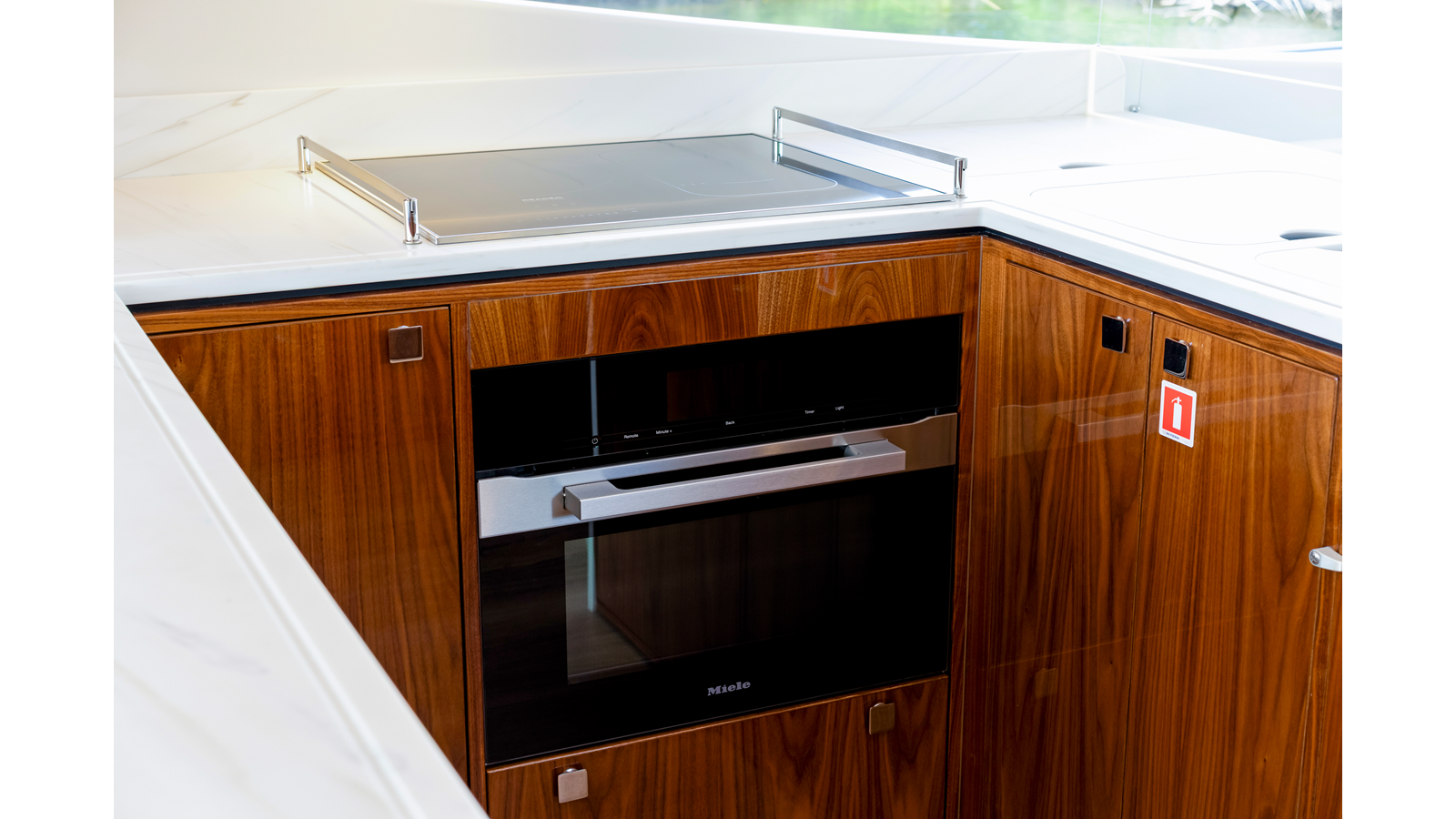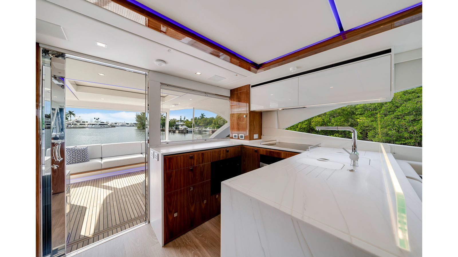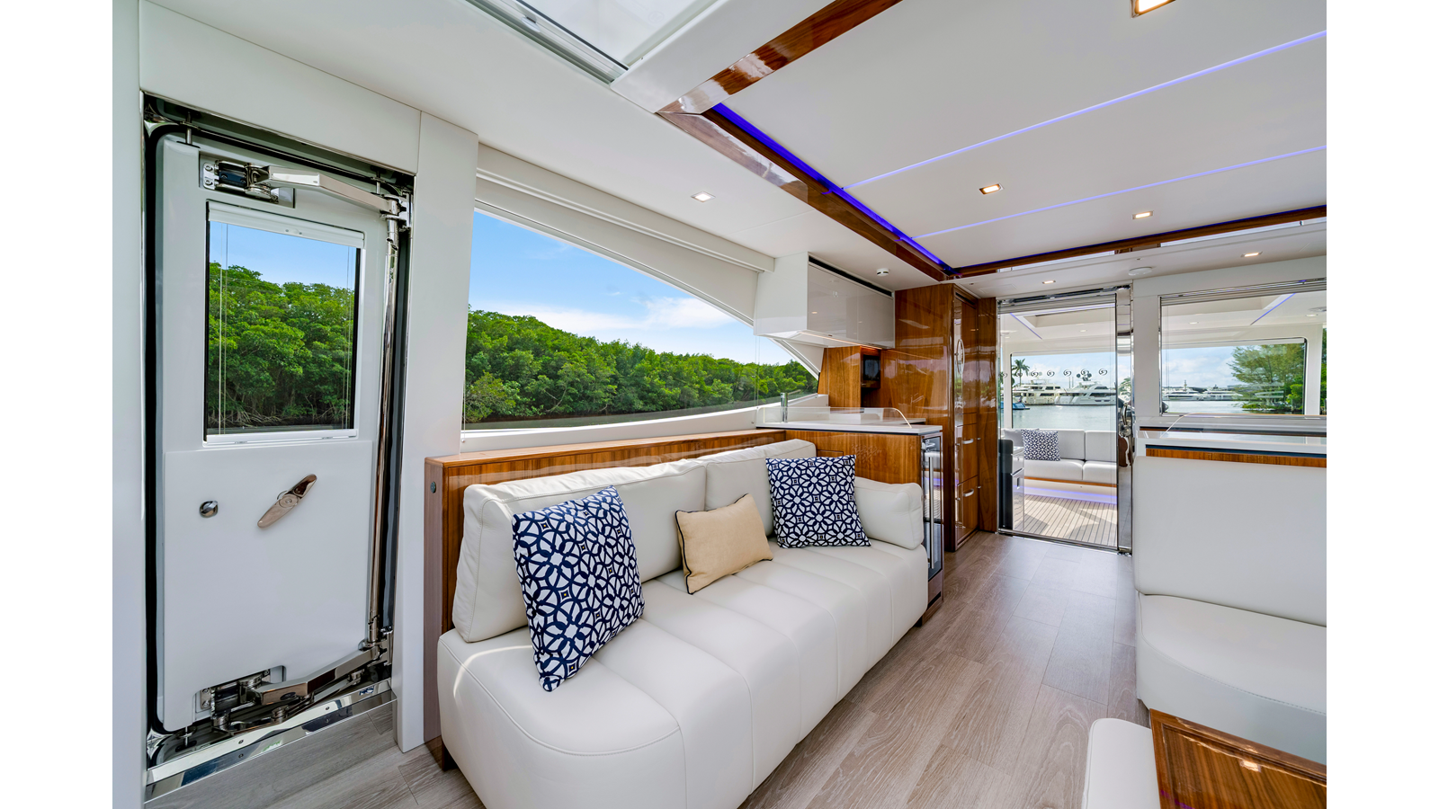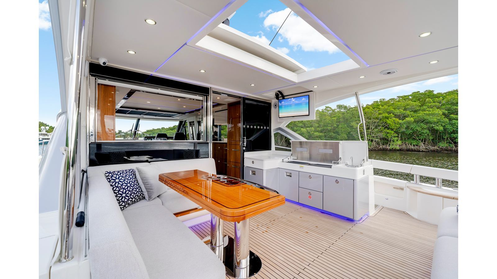 Slide open the saloon door. Then lower the electric galley window with the push of a button. Now the aft deck flows into the saloon creating one grand living and entertaining space with two designer dining areas.