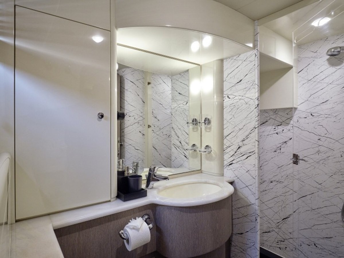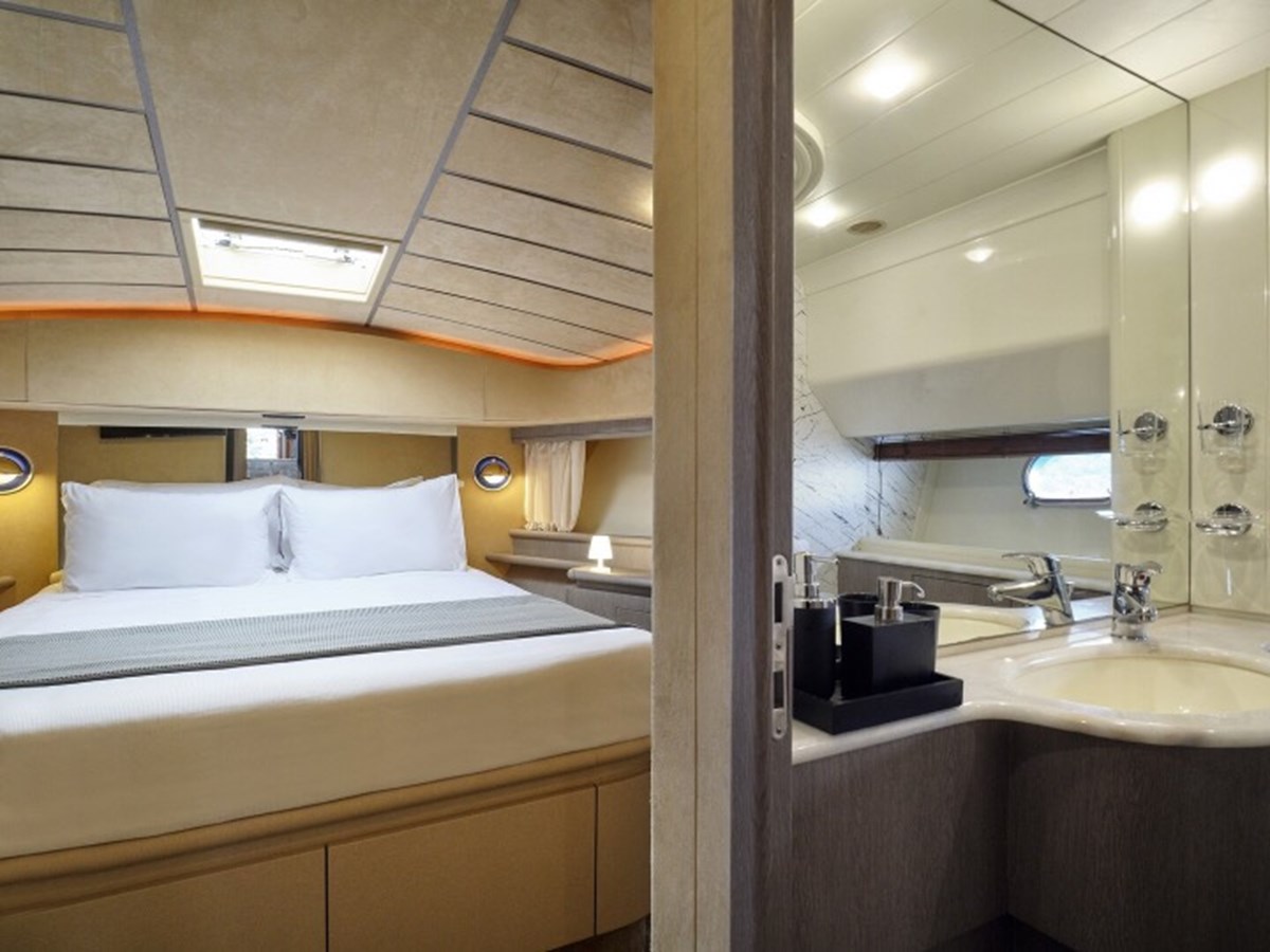 The Ferretti 680 accommodates up to 8 guests in 4 well-appointed cabins located on the lower deck: