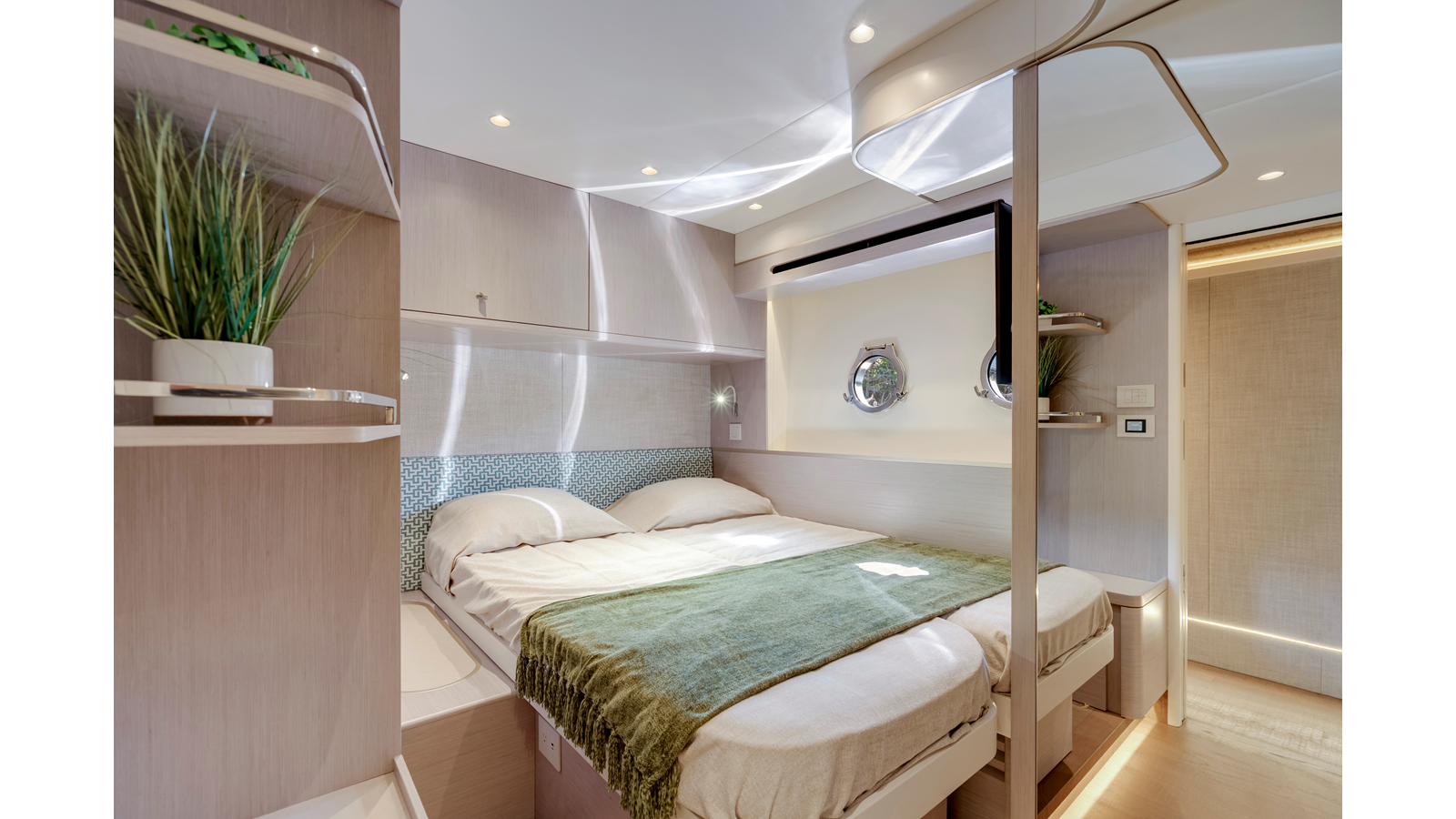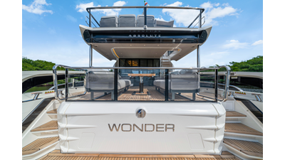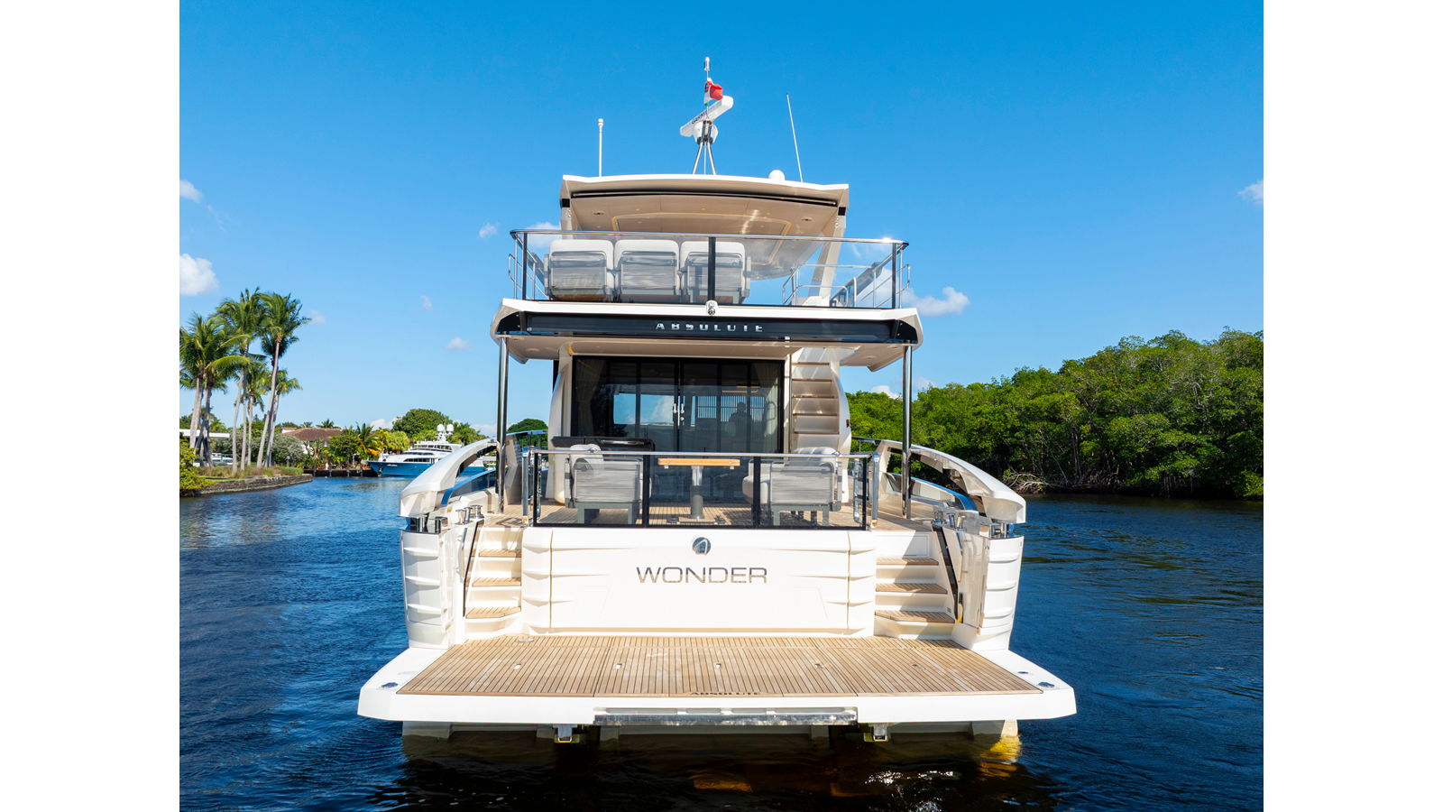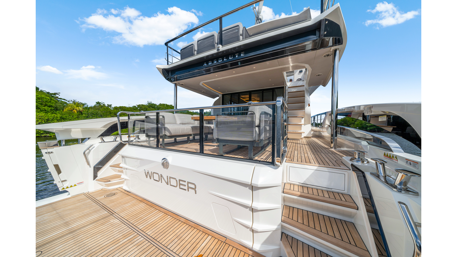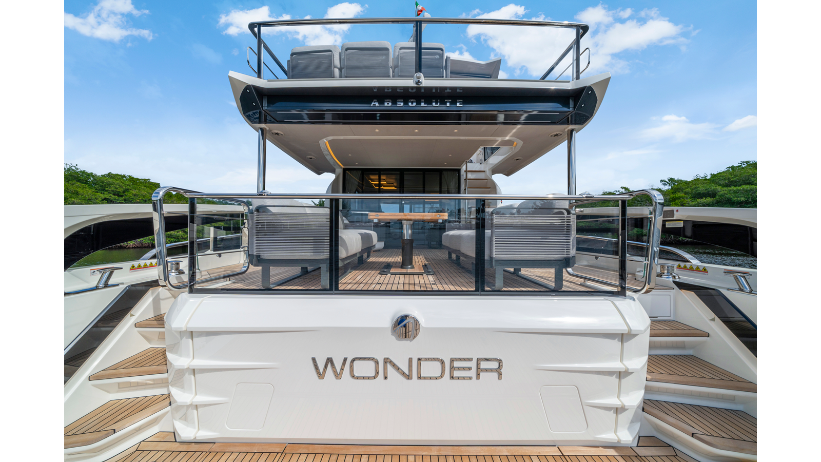 The Absolute 70 FLY “The Absolute Wonder” is a sophisticated flybridge yacht with seamless flow between interior and exterior. She features a sleek, sliding six-panel glass door opening to the cockpit, a step-free flybridge with modular furnishings, and a vertical-lowering swim platform for effortless water access. Below decks, her four-cabin layout (including a full-beam master and a VIP) plus crew accommodation deliver an exceptionally comfortable onboard experience. Powered by twin Volvo Penta IPS1350 engines, she combines performance, elegance, and modern design.