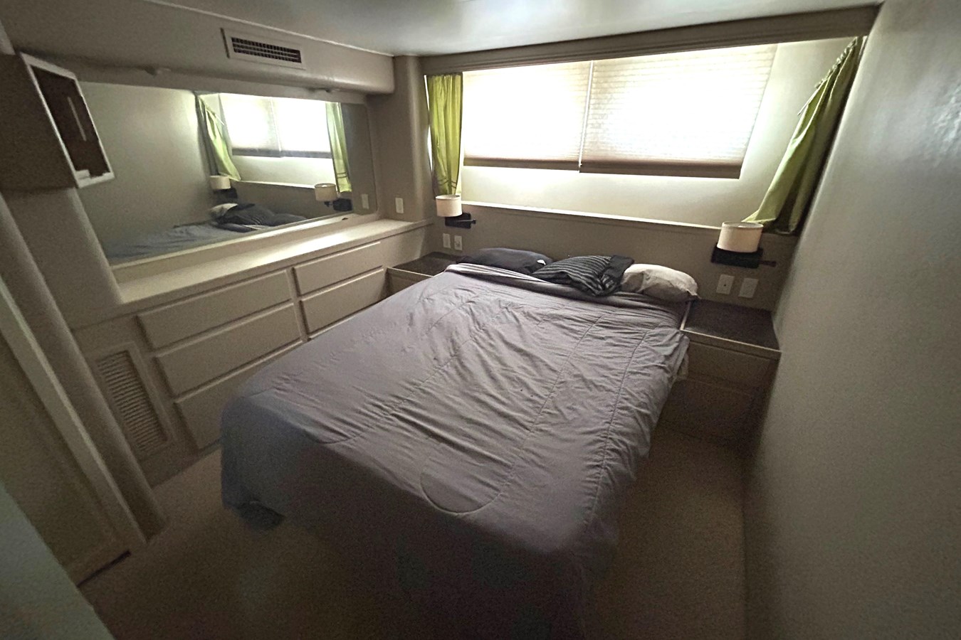 Captain from her sturdy pilothouse with port and starboard access while you entertain guests in the "up" galley and full beam salon. Or go up top to the spectacular flybridge complete with unparalleled views, a second helm , bar and seating plus wrap around seating for guests galore . And after a festive day at sea, you'll have sleeping accommodations for 8 passengers!