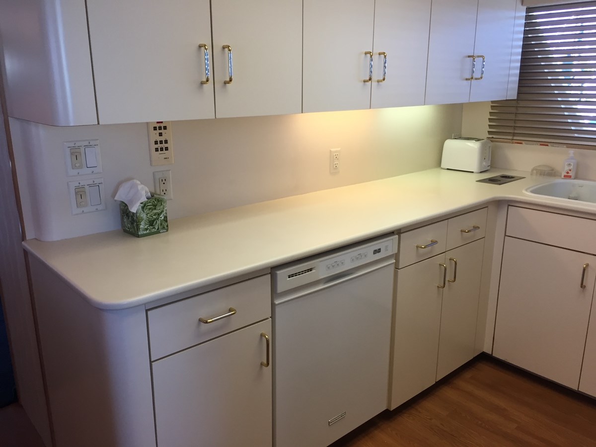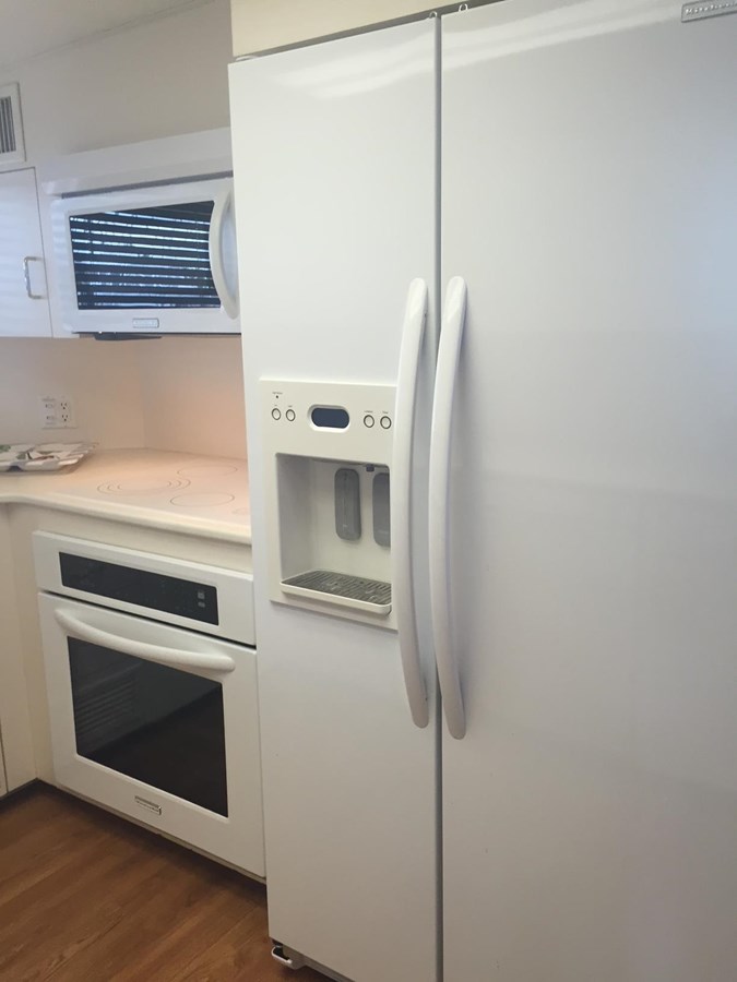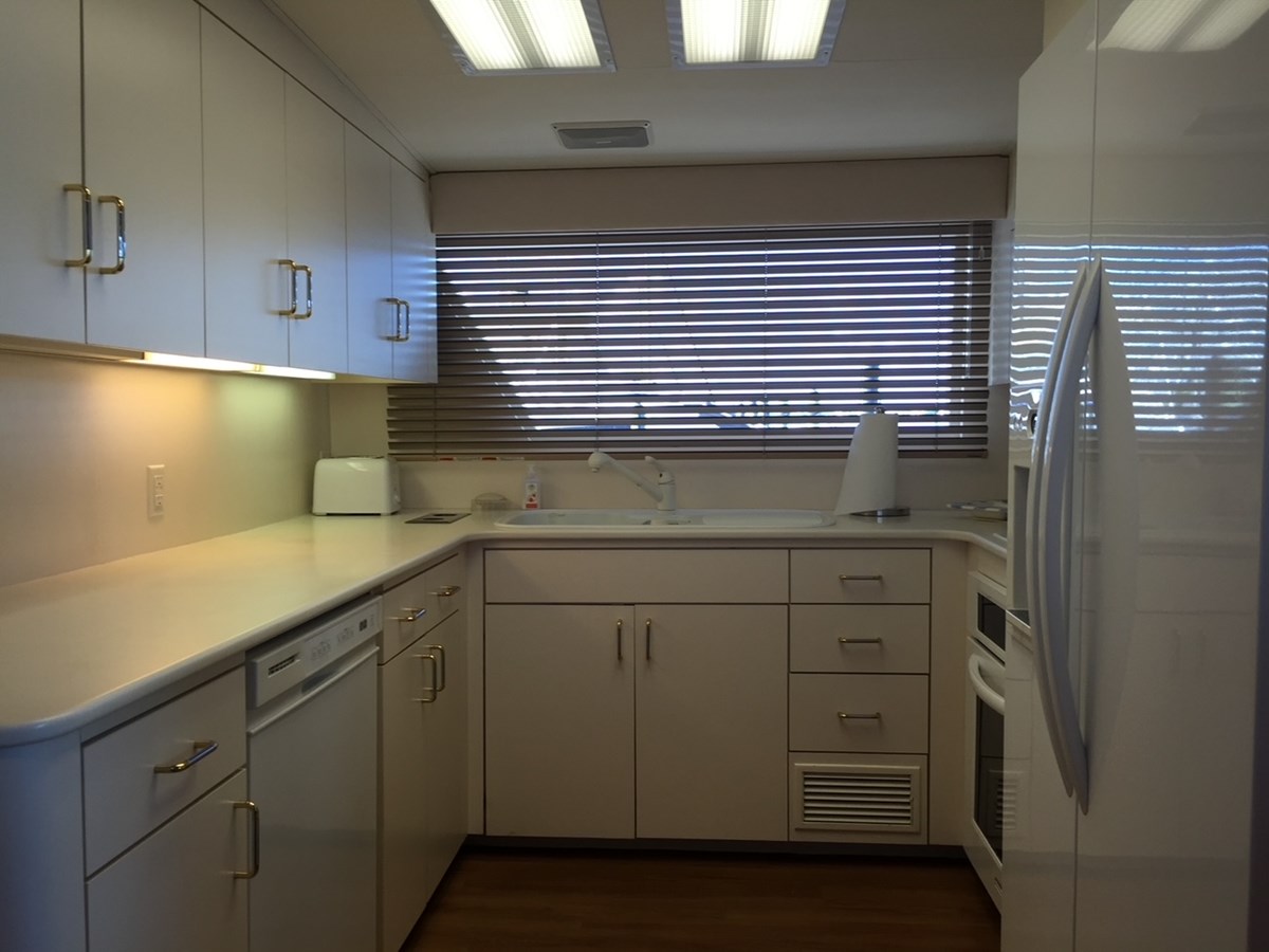Aft from the pilothouse, find the completely-enclosed galley with U-shape dinette, full-sized Kitchen Aid appliances, and wood flooring.