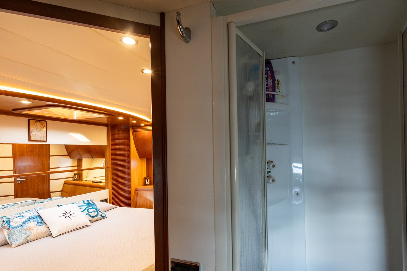 NAM has a sporty hull intended for day cruising, but with a well-articulated interior volume that guarantees even multi-day cruising in full comfort. The line overall of the boat is clean and sleek with the exterior profile contemporary and very elegant. The navigation console has generous instrumentation with full navigation instrumentation that offers chart plotting, GPS, engines and generators monitoring and controls, bow and stern thrusters’ commands, fire suppression system, etc. With well-appointed upholstered seats, NAM offers comfortable seating with excellent visibility. The large cockpit includes a large sofa with a folding table in the center and behind the helm seats, plus a cabinet that provides a retractable TV set. The cockpit design offers a smooth transition to the swimming platform to access the water.