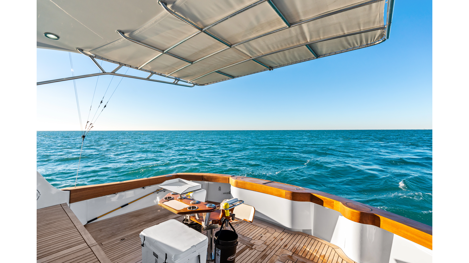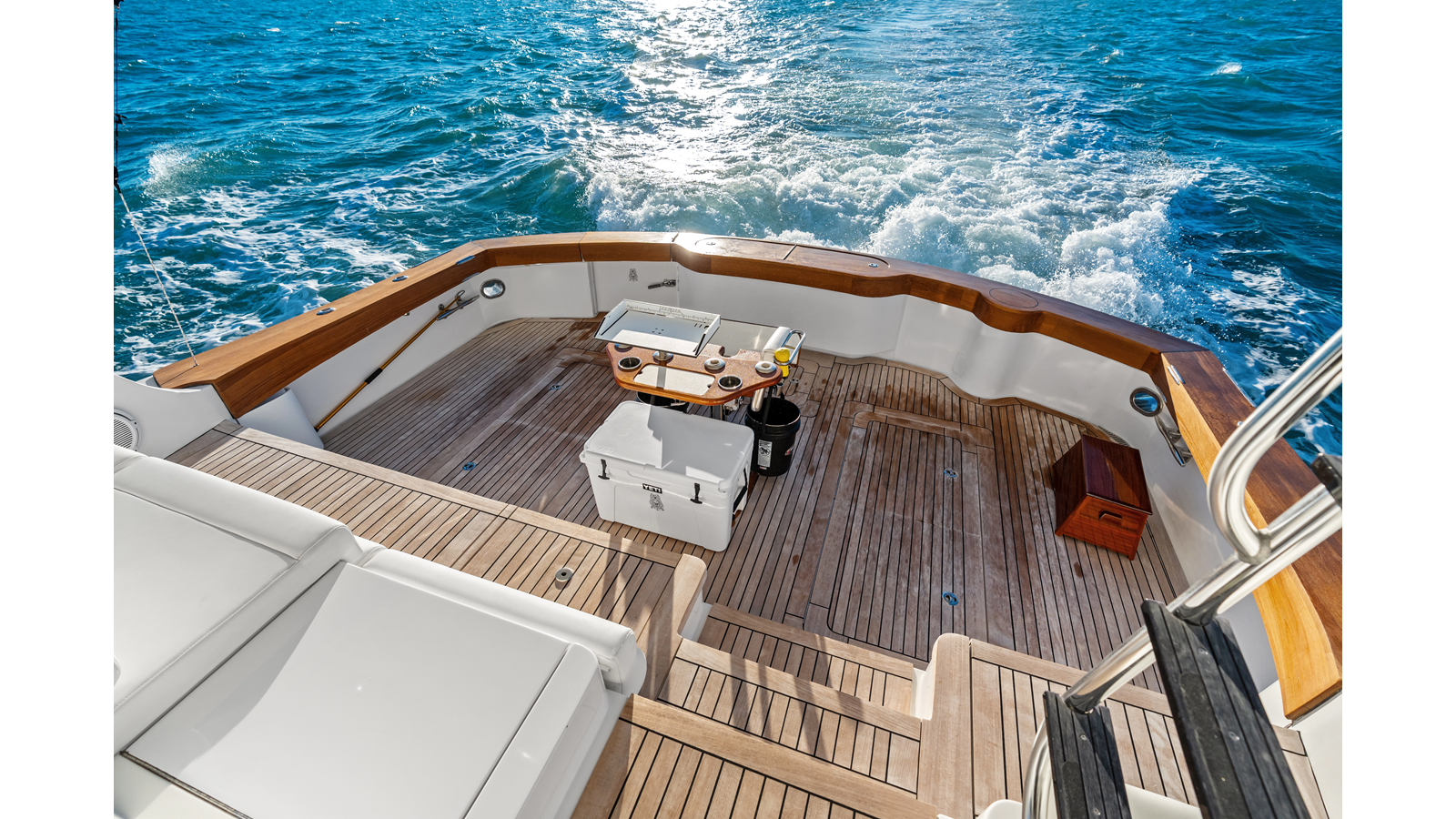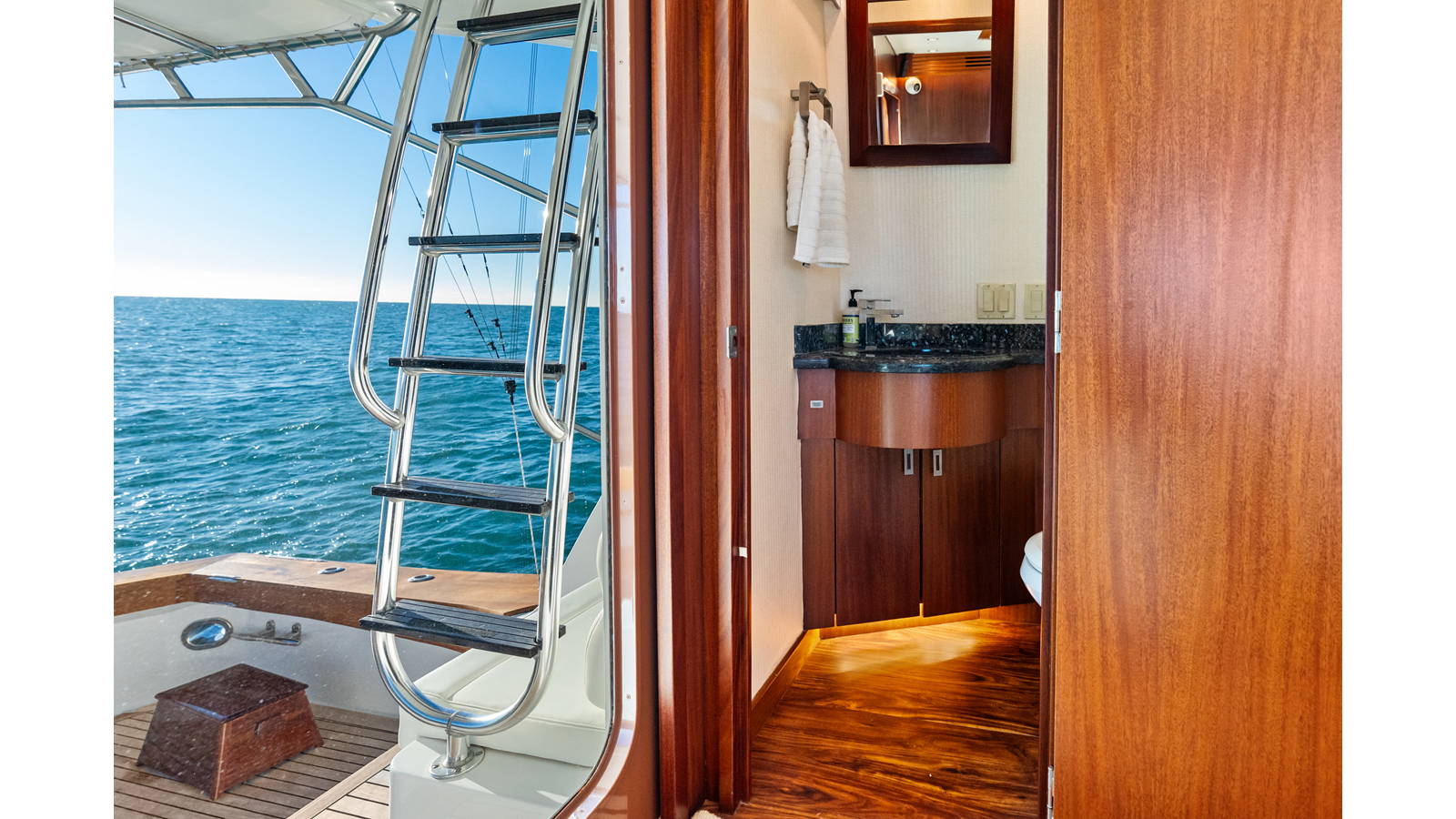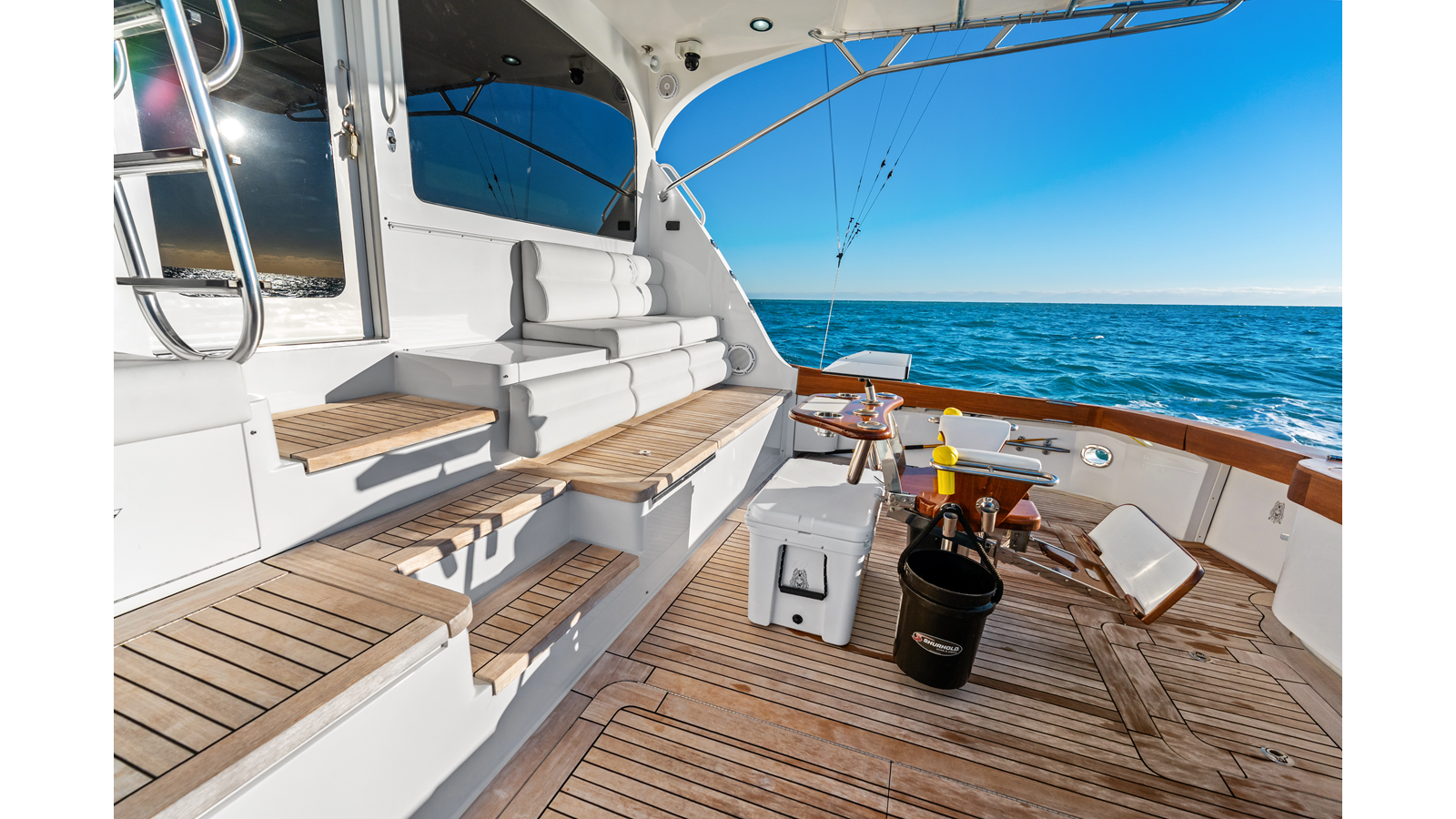 The teak cockpit is designed for serious fishing, offering expansive deck space, mezzanine seating, in-deck fish boxes, tackle storage. Engine room access is excellent, making service and inspections straightforward. This layout supports both competitive fishing and owner-operator use.