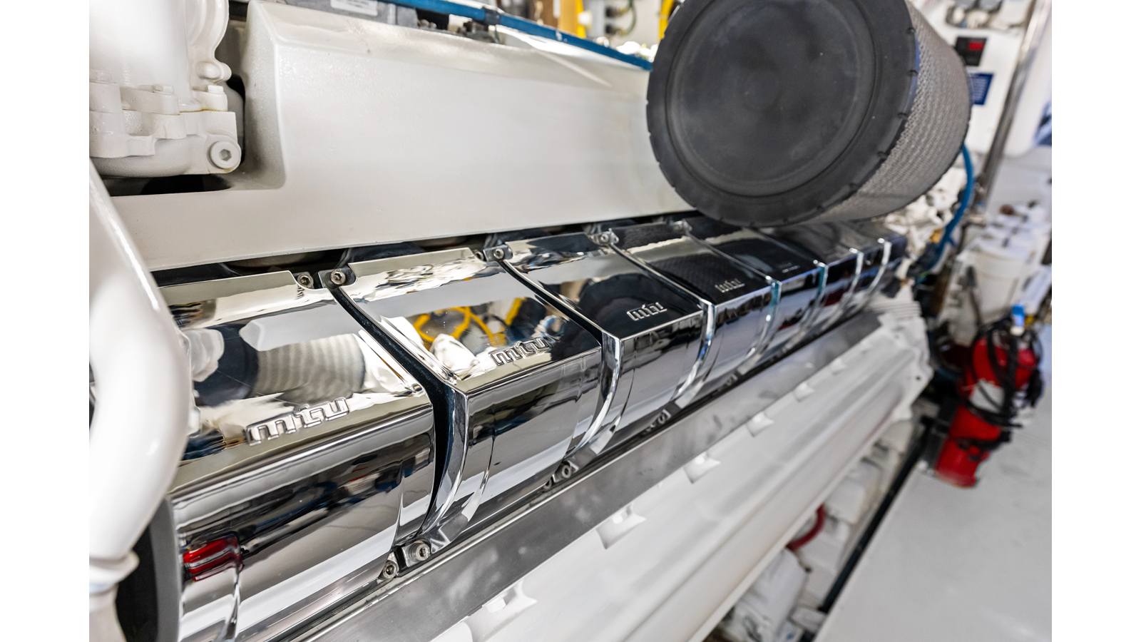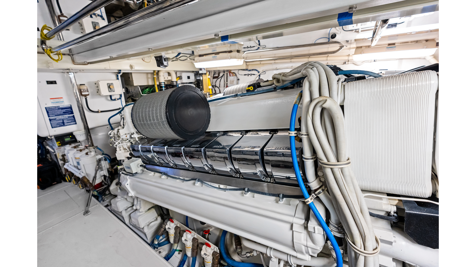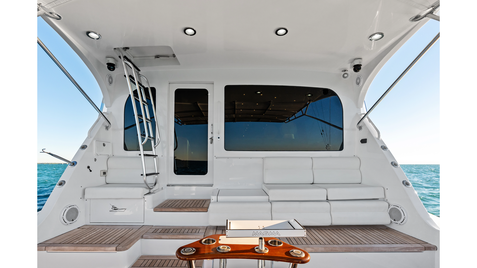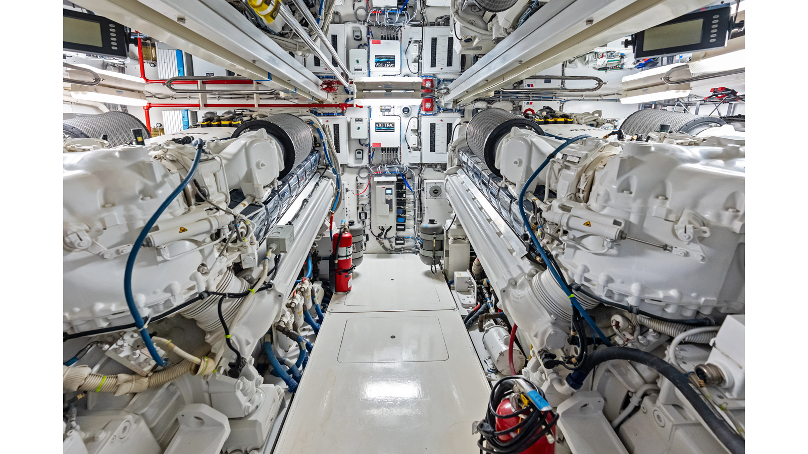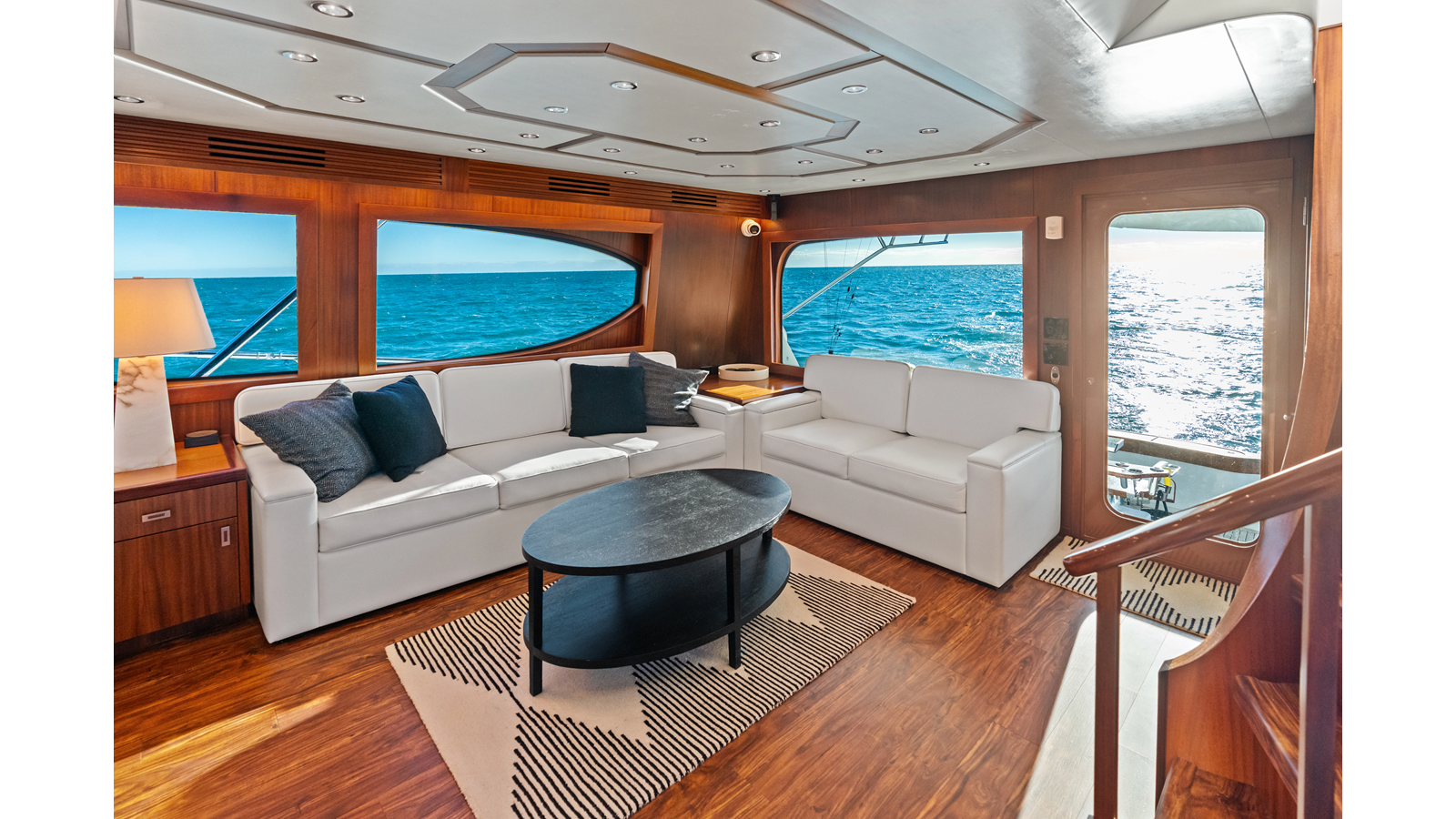 The teak cockpit is designed for serious fishing, offering expansive deck space, mezzanine seating, in-deck fish boxes, tackle storage. Engine room access is excellent, making service and inspections straightforward. This layout supports both competitive fishing and owner-operator use.