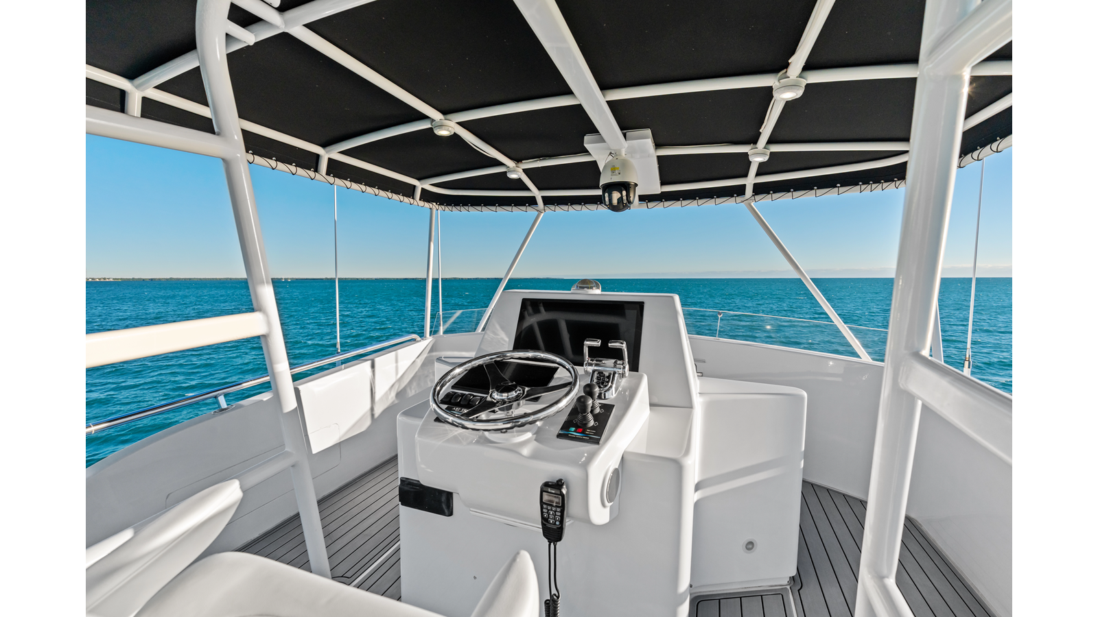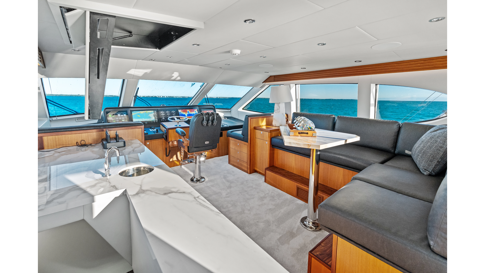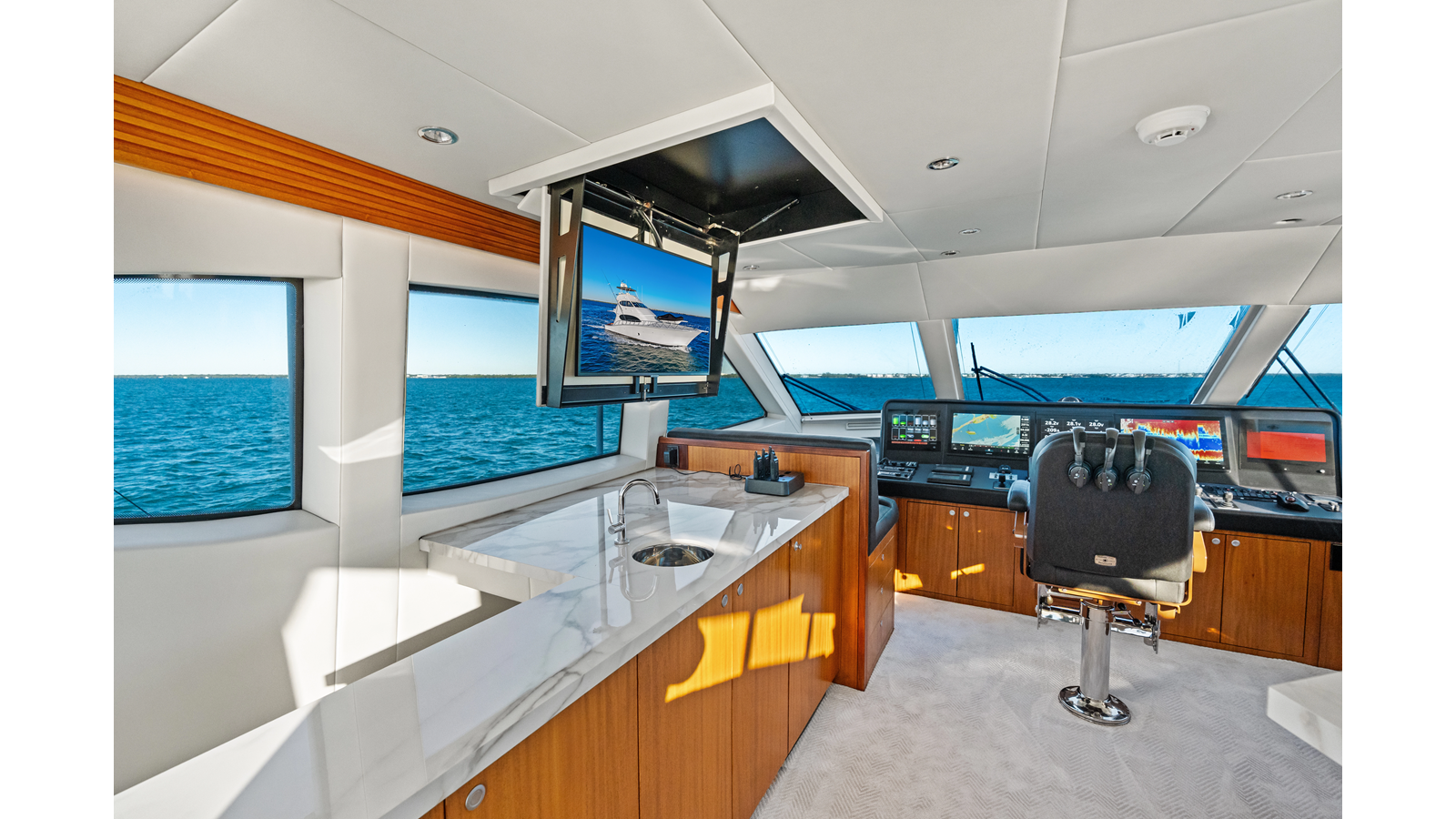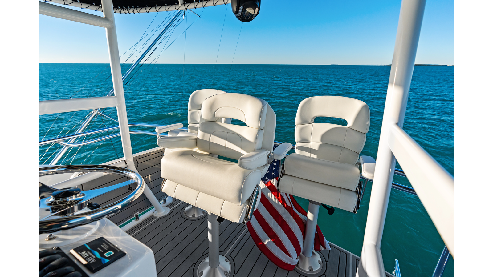 The enclosed bridge is a standout feature, functioning as both a command helm and climate-controlled sky lounge. Forward, the helm provides excellent visibility and space for the all new electronics suite, with 3 22” Garmin displays, Aft, comfortable seating and entertainment amenities including a overhead mounted TV with Starlink connectivity , and a full bar to port with a sink make this area ideal for entertaining guests while underway.