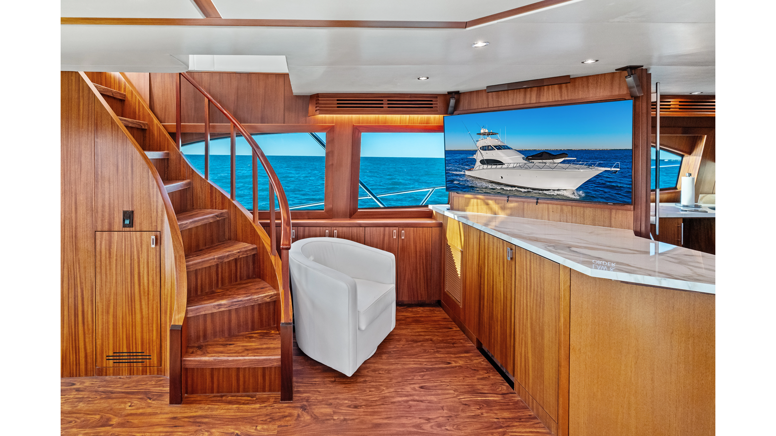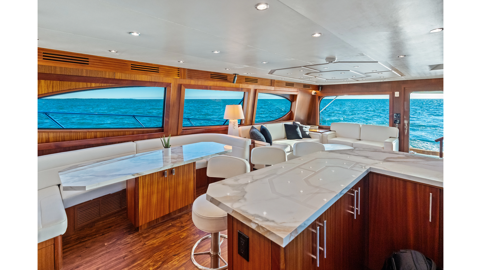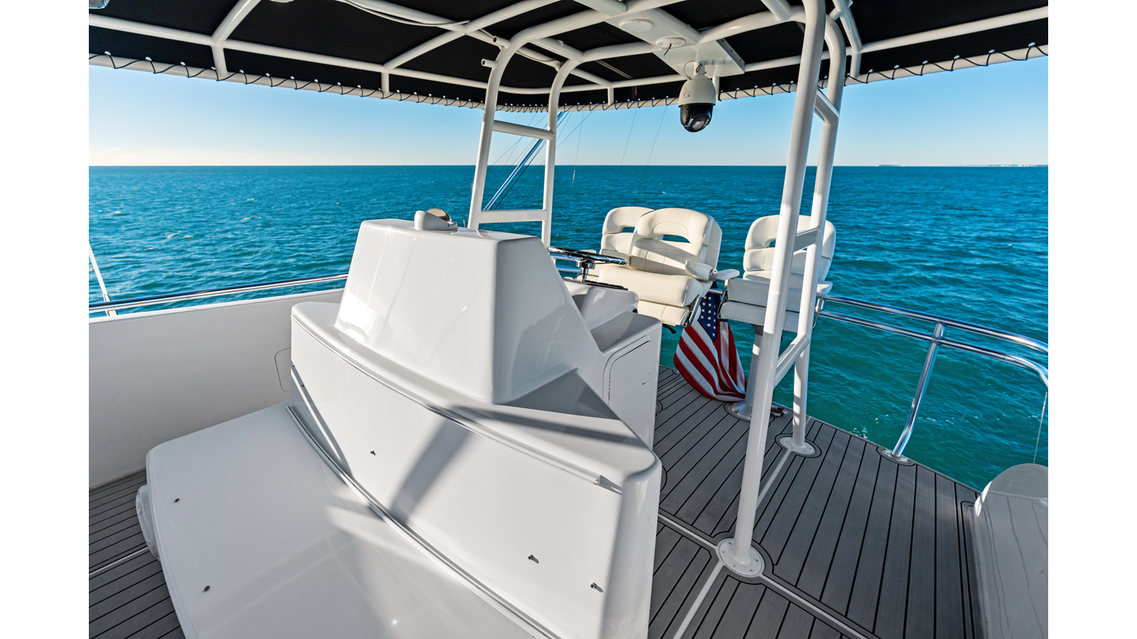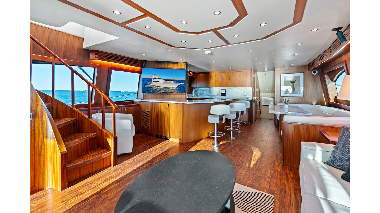 The enclosed bridge is a standout feature, functioning as both a command helm and climate-controlled sky lounge. Forward, the helm provides excellent visibility and space for the all new electronics suite, with 3 22” Garmin displays, Aft, comfortable seating and entertainment amenities including a overhead mounted TV with Starlink connectivity , and a full bar to port with a sink make this area ideal for entertaining guests while underway.