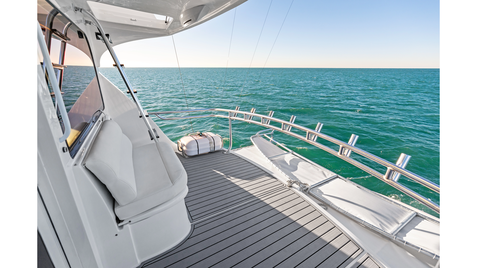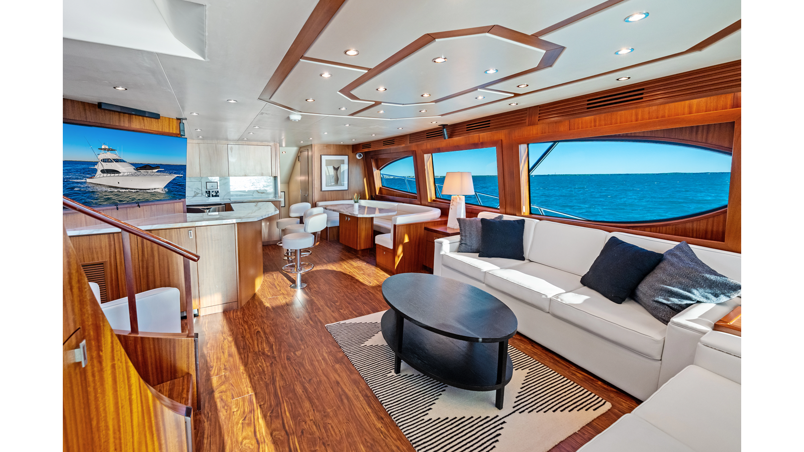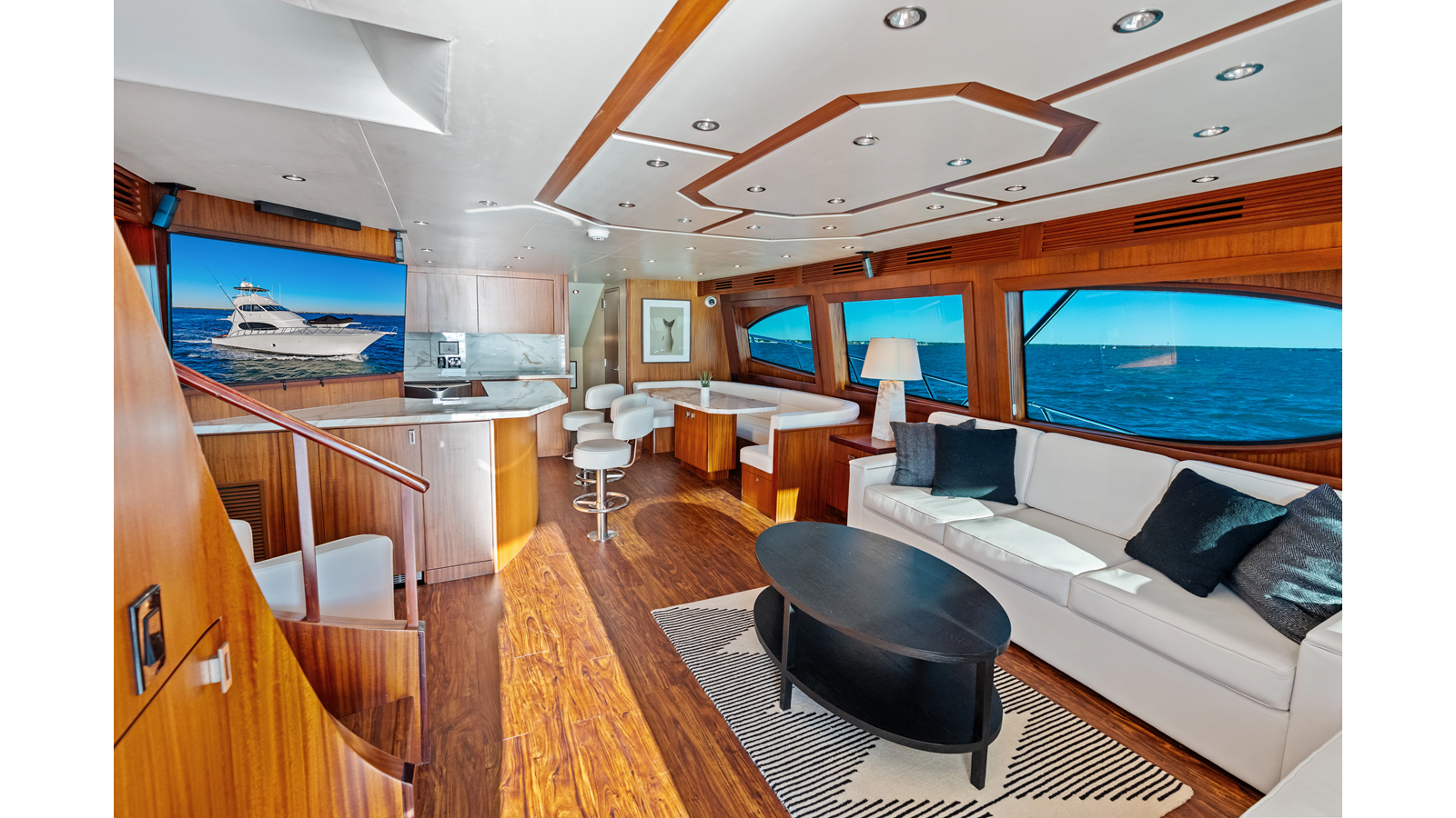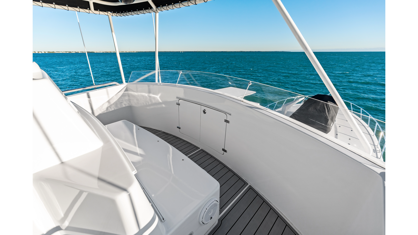 The enclosed bridge is a standout feature, functioning as both a command helm and climate-controlled sky lounge. Forward, the helm provides excellent visibility and space for the all new electronics suite, with 3 22” Garmin displays, Aft, comfortable seating and entertainment amenities including a overhead mounted TV with Starlink connectivity , and a full bar to port with a sink make this area ideal for entertaining guests while underway.