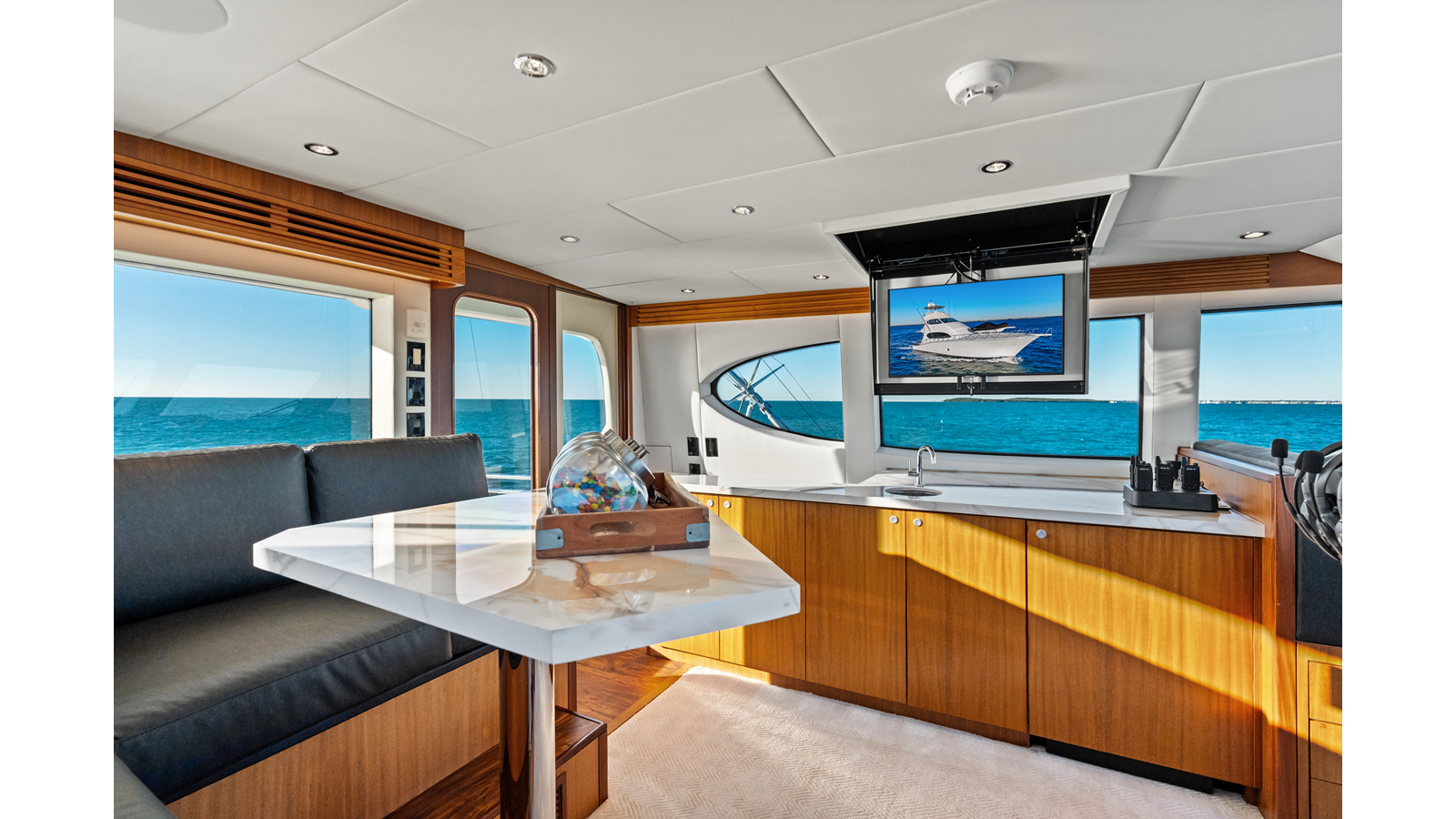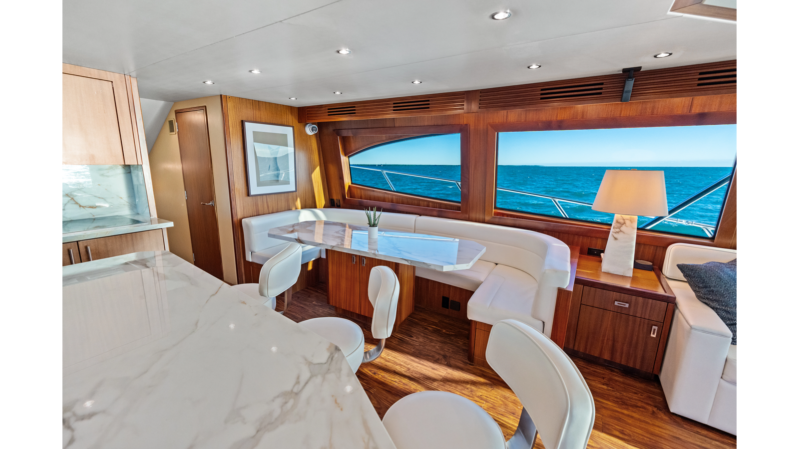Entering the salon, the interior is open and bright with high-quality custom wood finishes, large windows, and a comfortable seating arrangement. To starboard is a spacious L-shaped settee, while the port side features cabinetry and an entertainment center. The salon flows seamlessly forward to the galley and dinette, creating an ideal main-deck layout for cruising and entertaining.