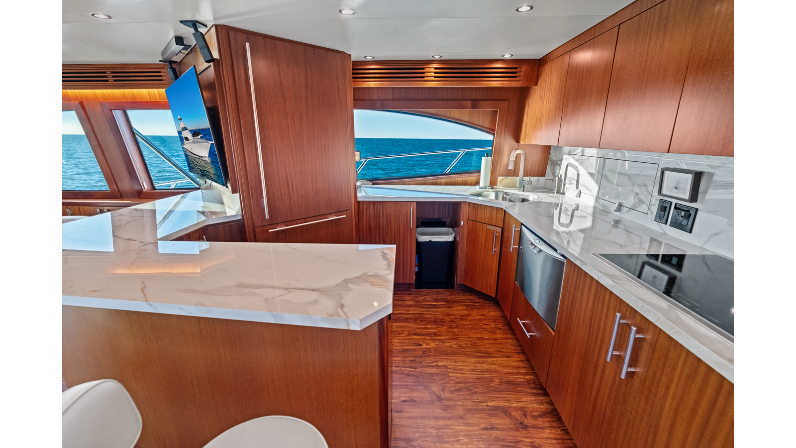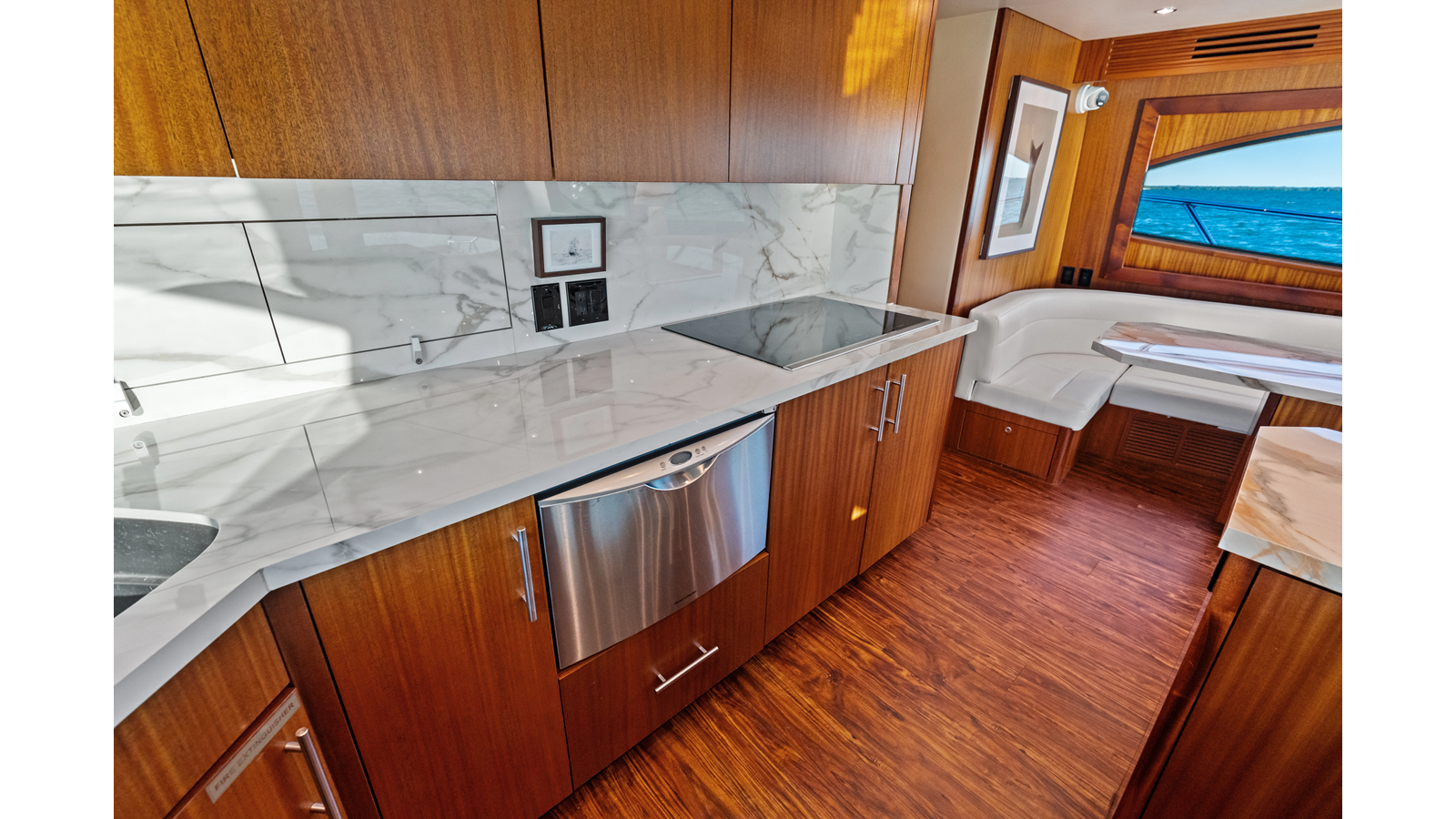The galley is fully equipped with all new appliances including a full-sized Miele refrigerator, new marble countertops, and abundant storage. The forward dinette offers excellent visibility and serves as a functional gathering space underway or at anchor. Forward of this area to starboard is a utility room with new Samsung washer and dryer.