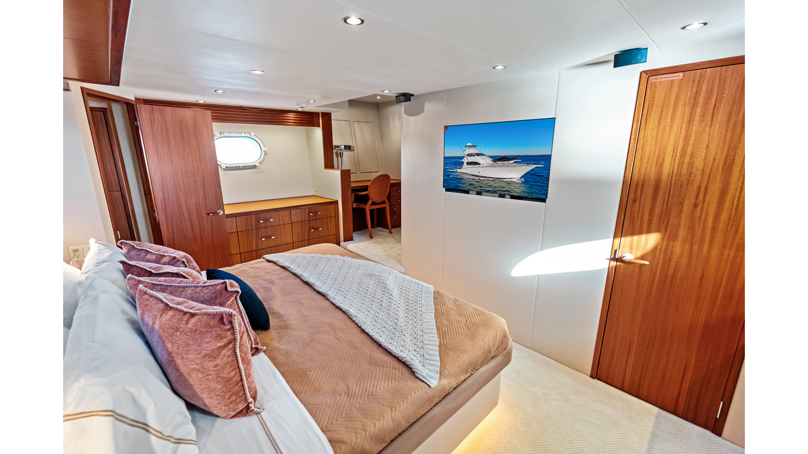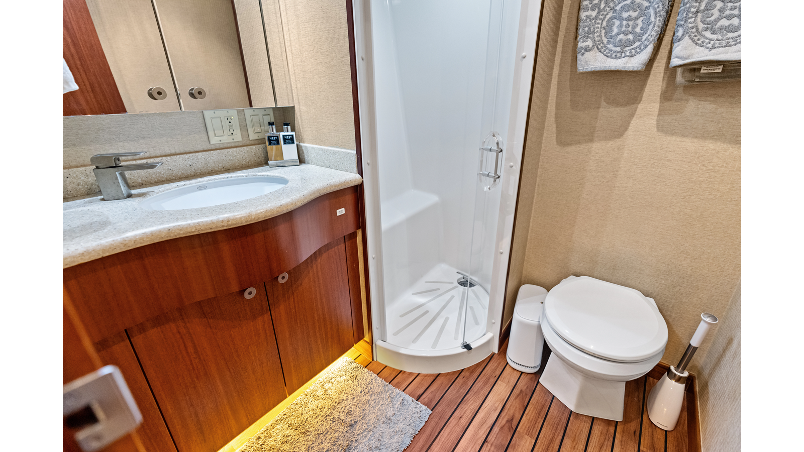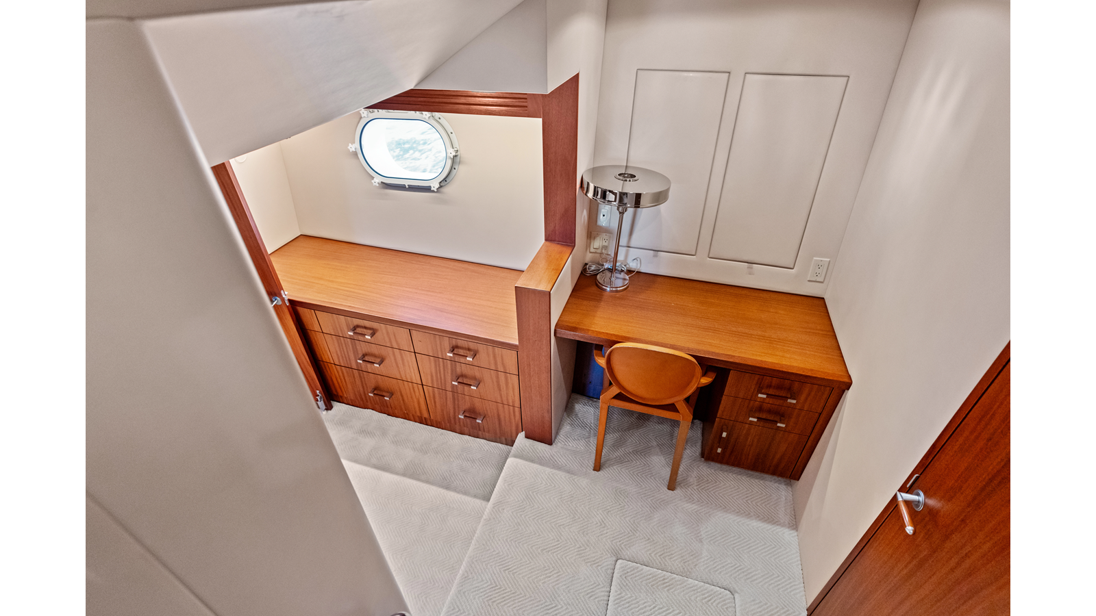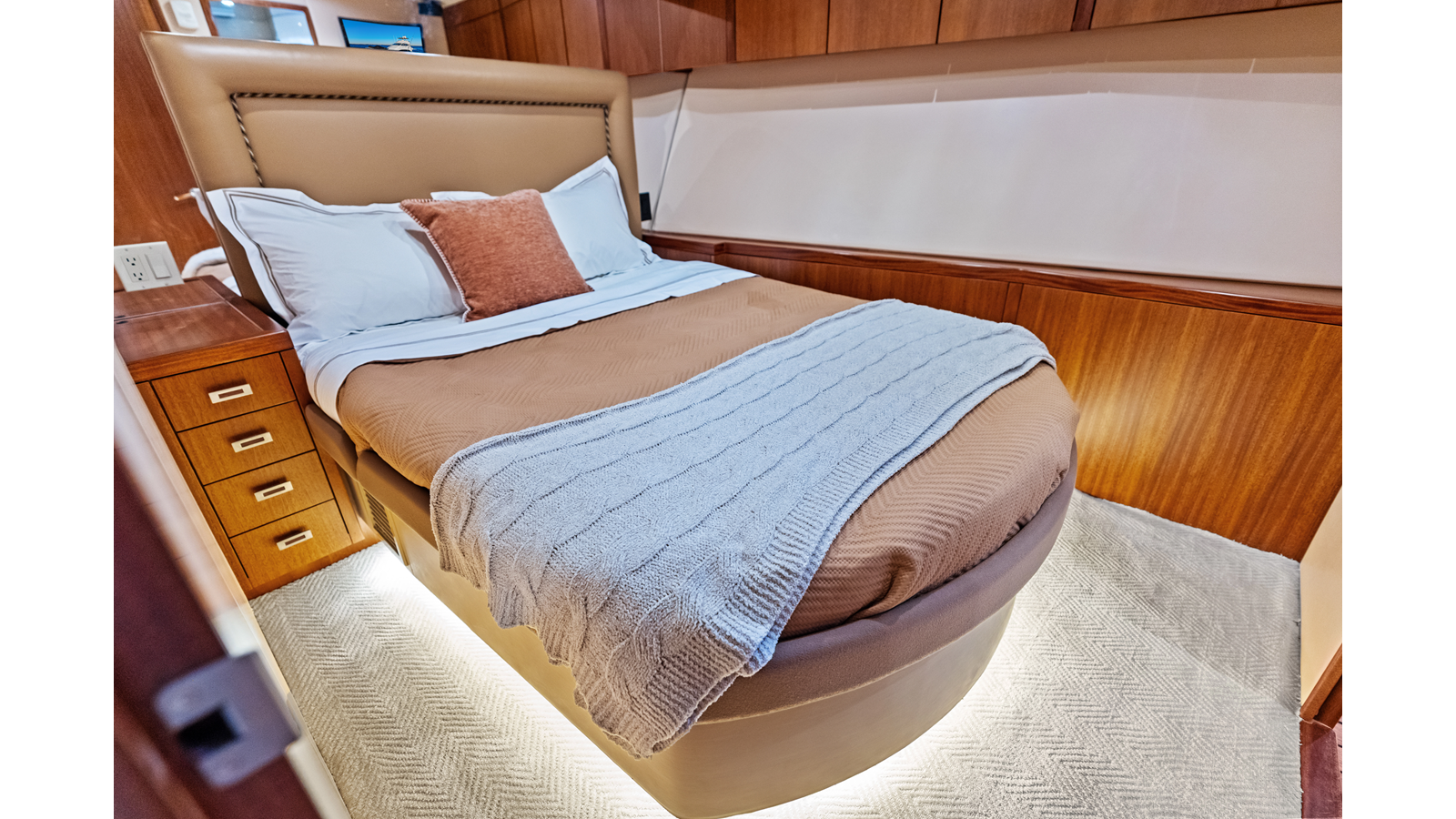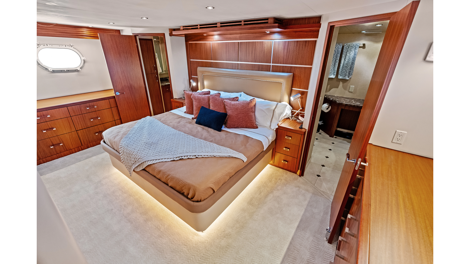 The lower accommodations on FIRTH'S CHASM offers a highly desirable four-stateroom, six-head layout. The full-beam master stateroom amidships features a king berth, ample storage, and a private en-suite head with separate shower. The forward VIP stateroom includes a queen berth and private head access. Two additional guest staterooms, one twin and a double, each with en-suite heads, provide comfortable accommodations for owners and guests.