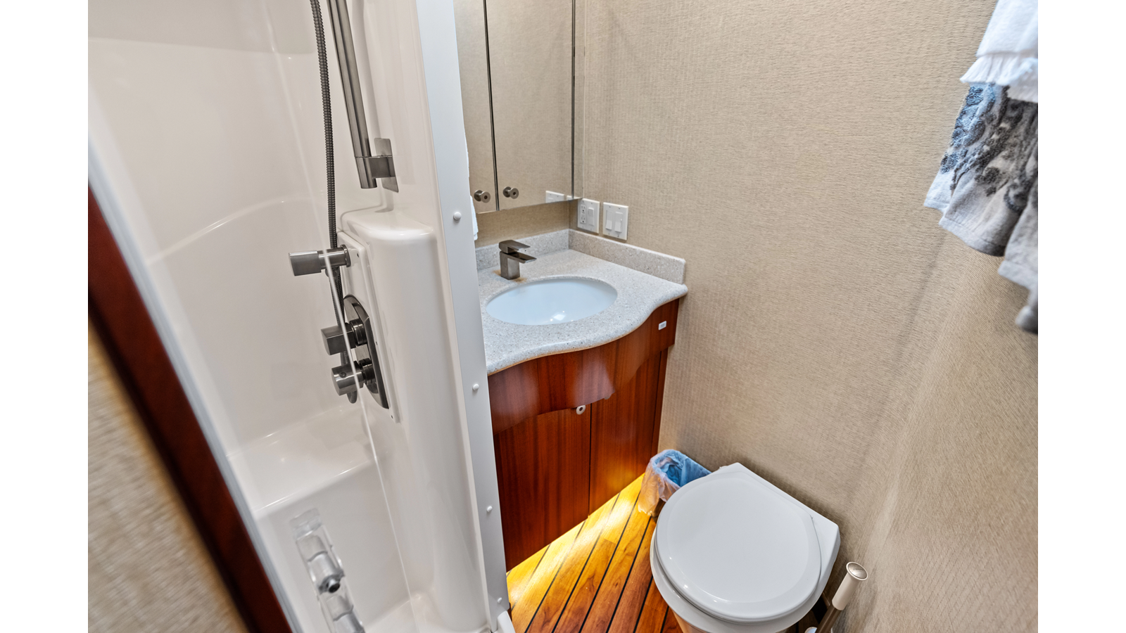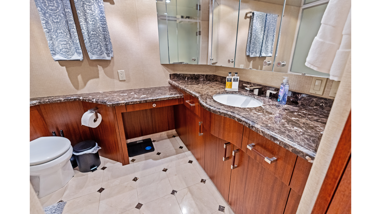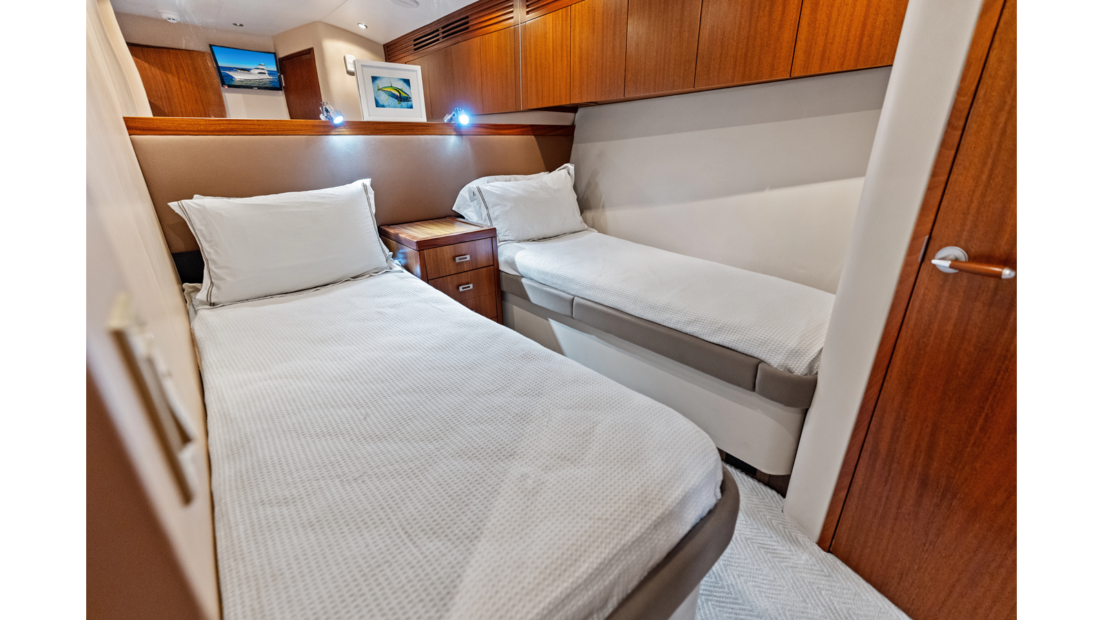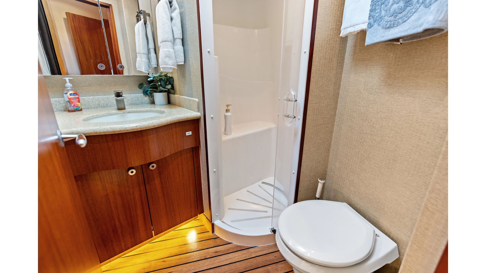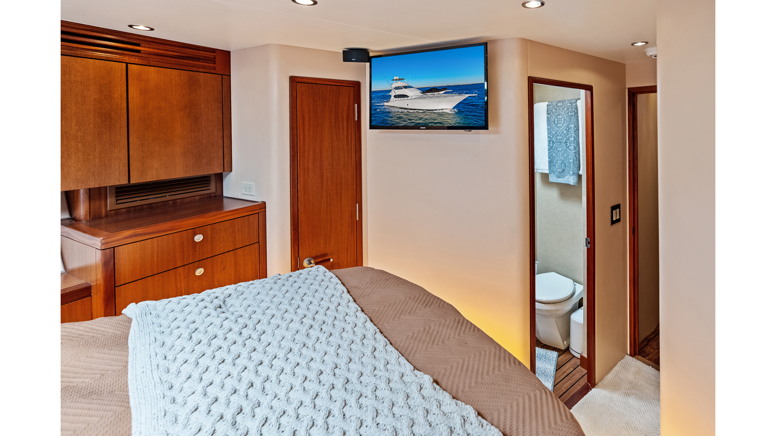 The lower accommodations on FIRTH'S CHASM offers a highly desirable four-stateroom, six-head layout. The full-beam master stateroom amidships features a king berth, ample storage, and a private en-suite head with separate shower. The forward VIP stateroom includes a queen berth and private head access. Two additional guest staterooms, one twin and a double, each with en-suite heads, provide comfortable accommodations for owners and guests.