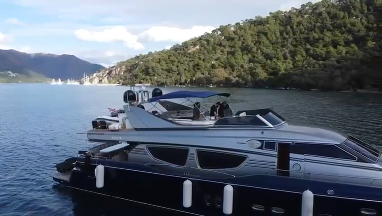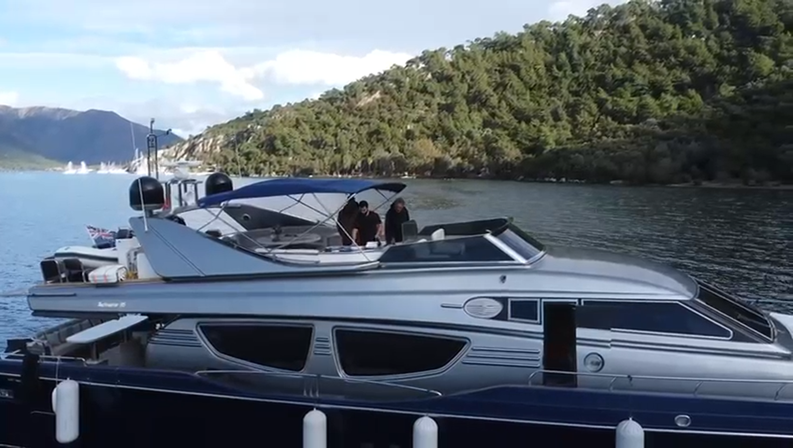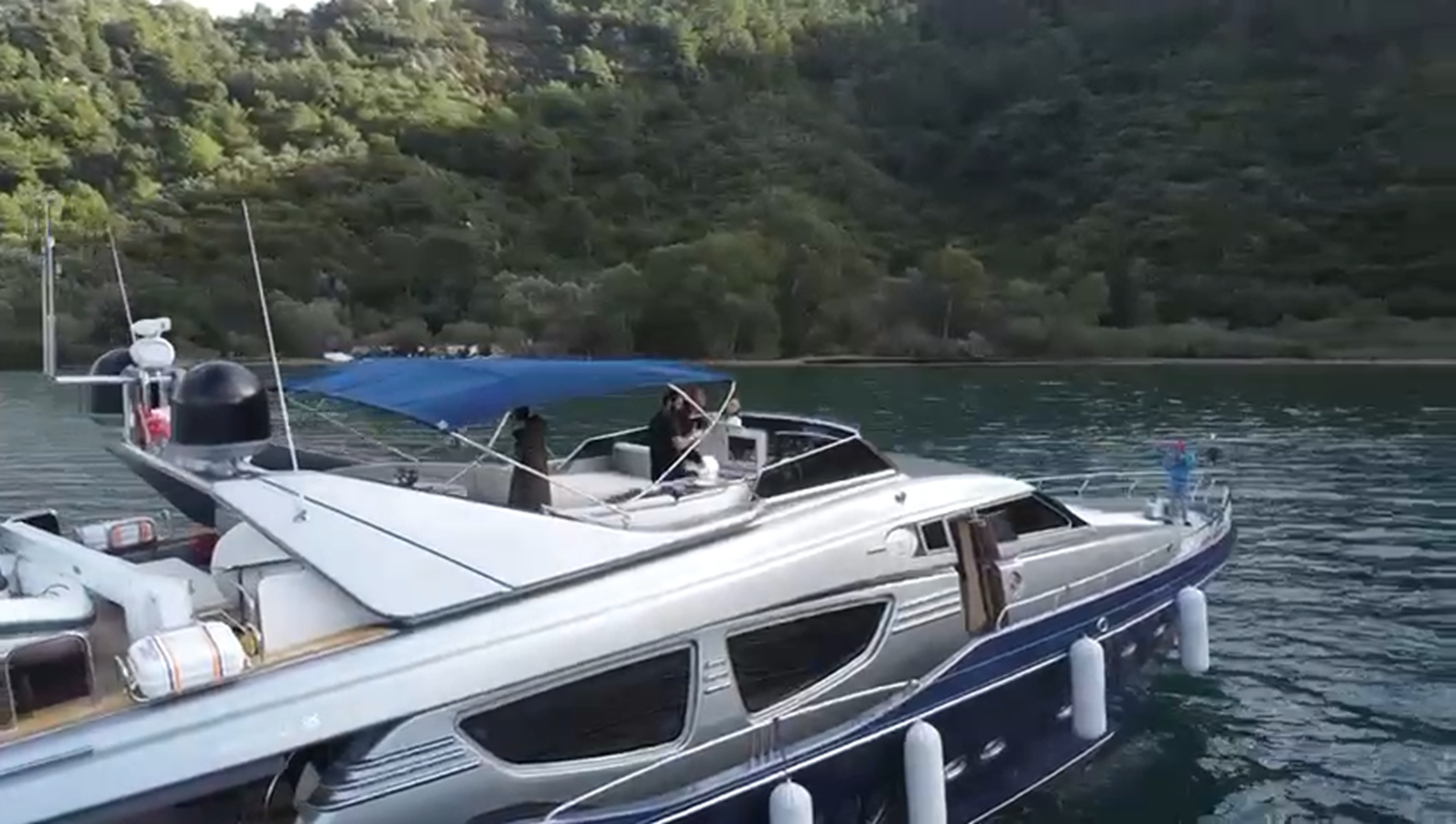 It has a light satin elm interior with parquet floor, leather sofas and a 5th daily bathroom, plus 4 guests cabins, all with private bathrooms. The exterior decks, all in teak, offer different alfresco spaces with a remarkable flybridge area including a barbacue, a bar, a minibar, and the sink.