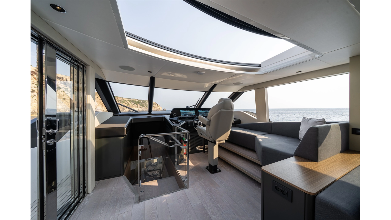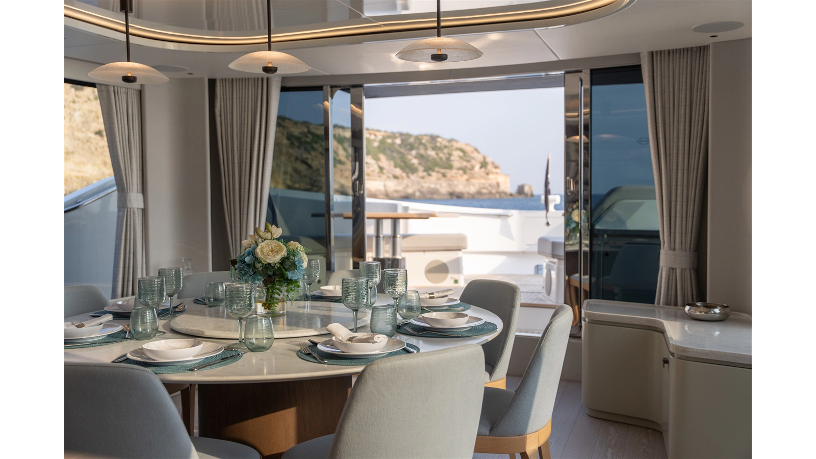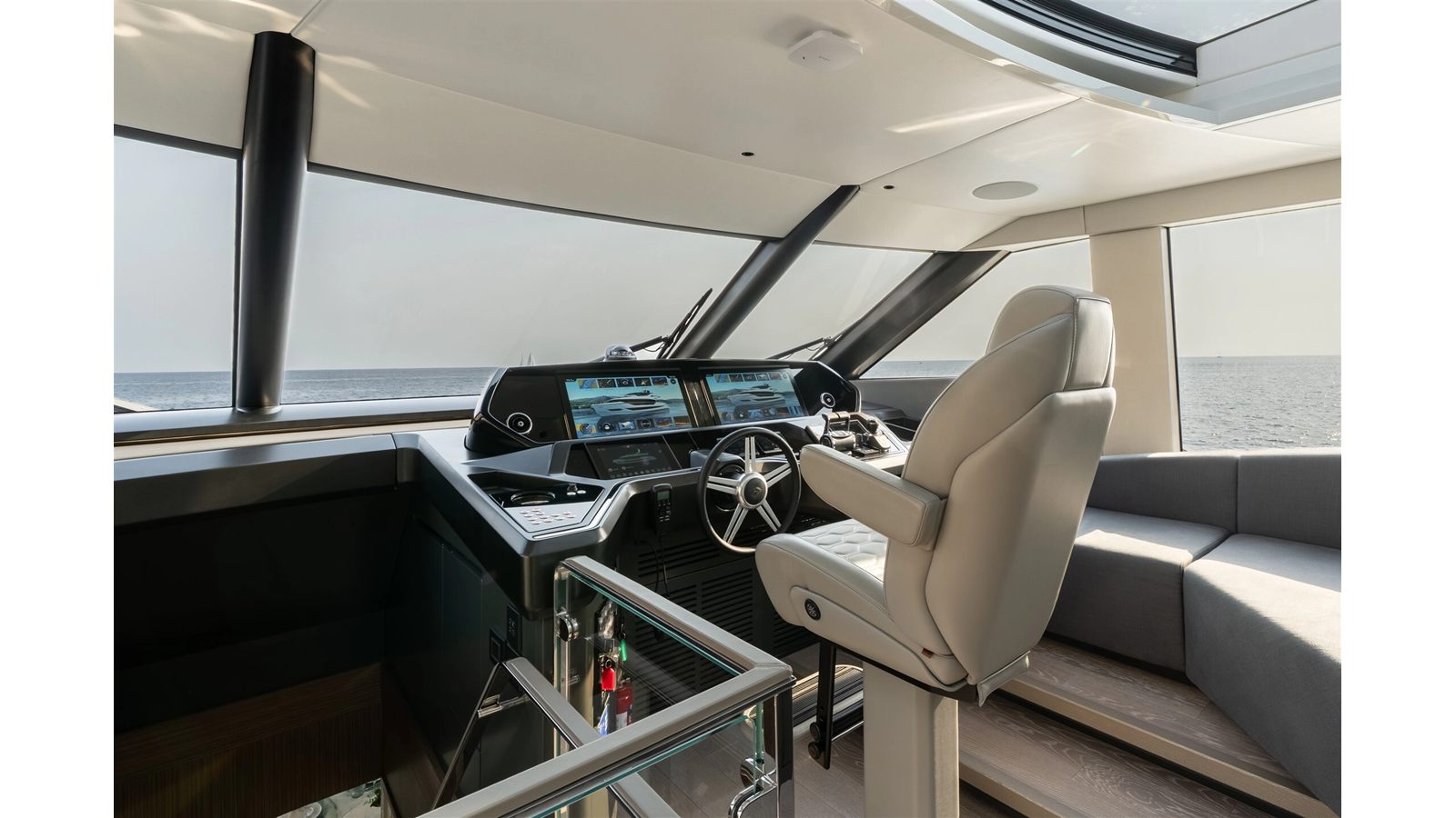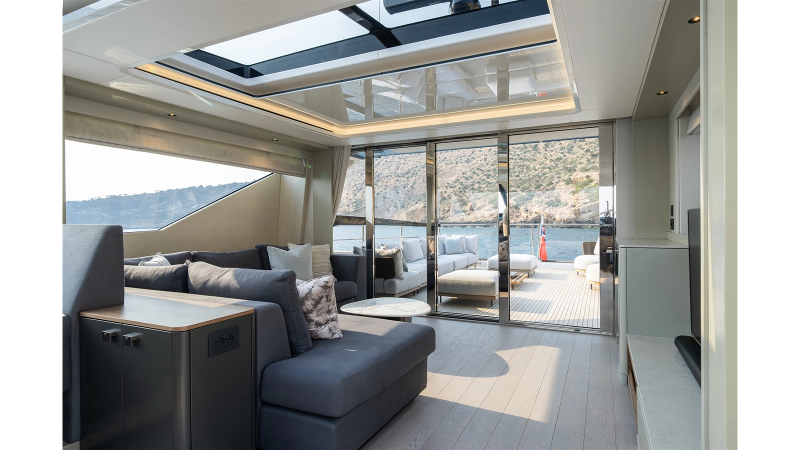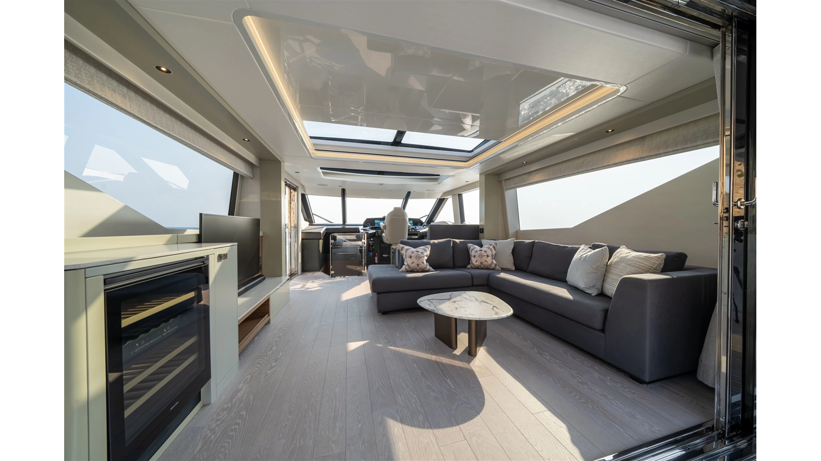 The 82 Ocean Enclosed offers the same expansive layout as the open version, enhanced with additional protection and climate versatility. Designed for year-round cruising in a wide range of conditions, she maintains generous social spaces and a refined interior while increasing comfort and usability in varied climates.