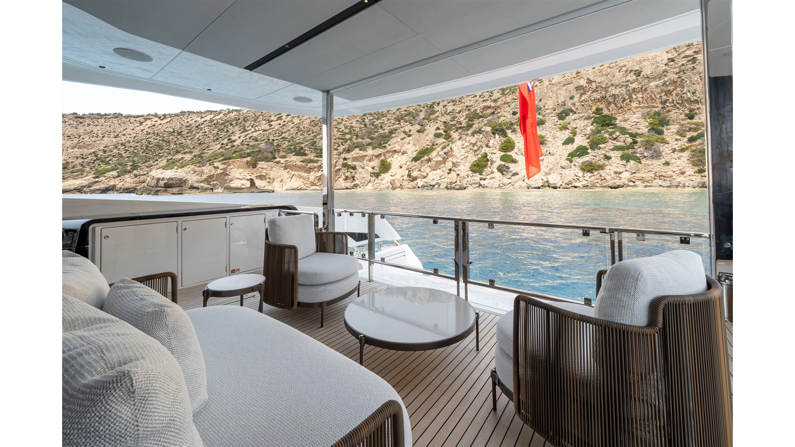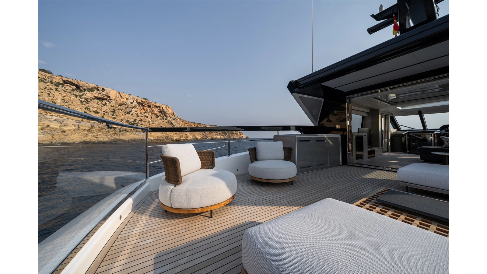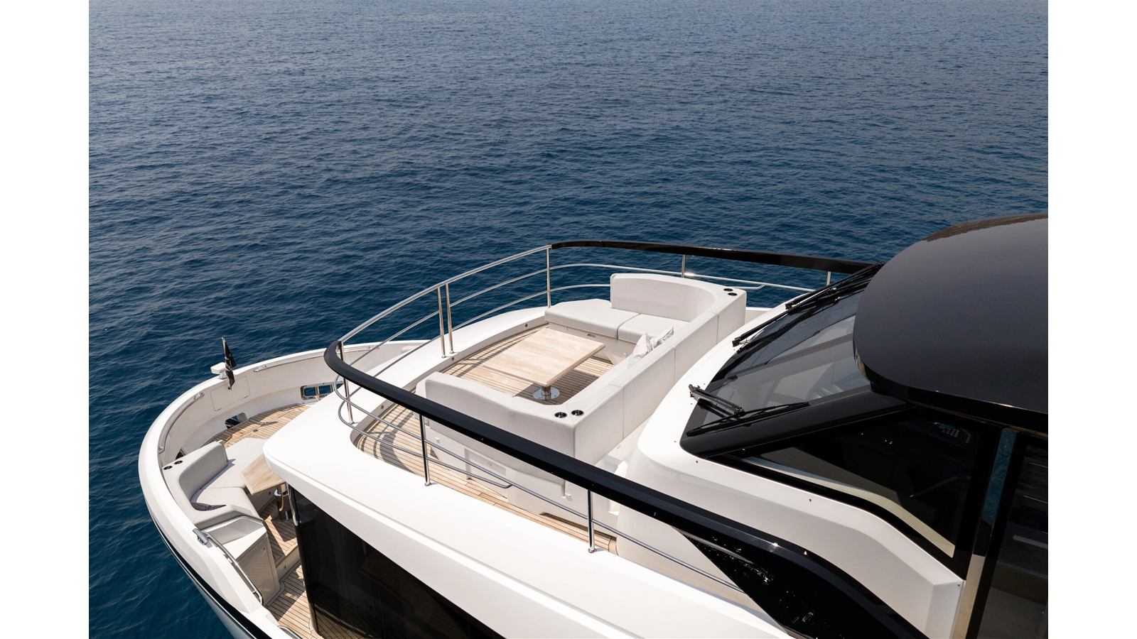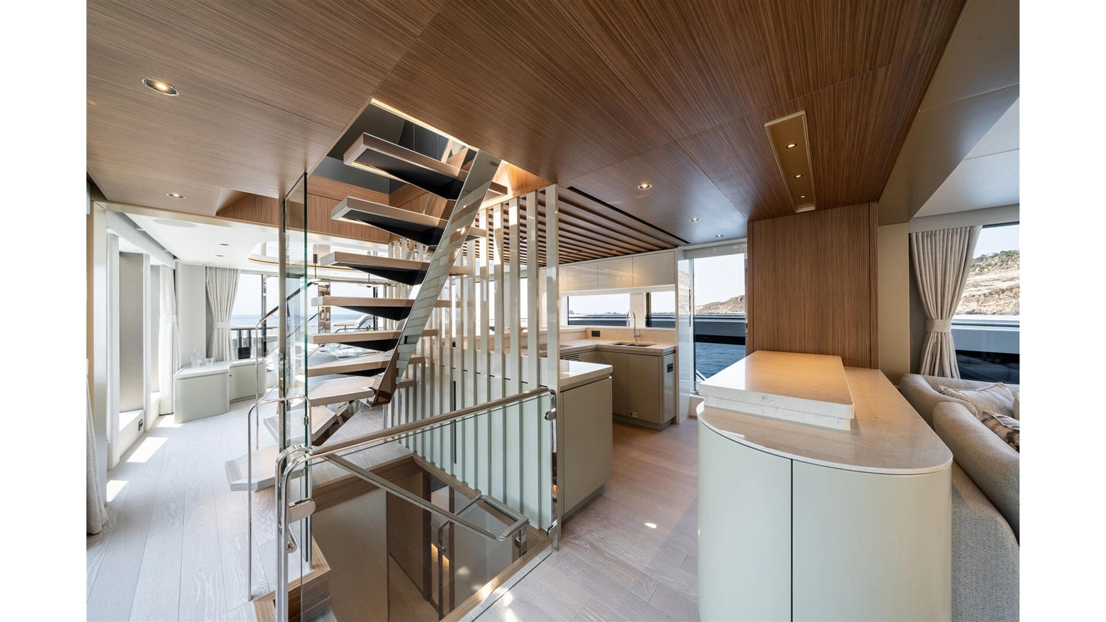 - Integrated exterior staircase from Aft Cockpit to flybridge with Carbon fibre companionway hatch at top of stairs