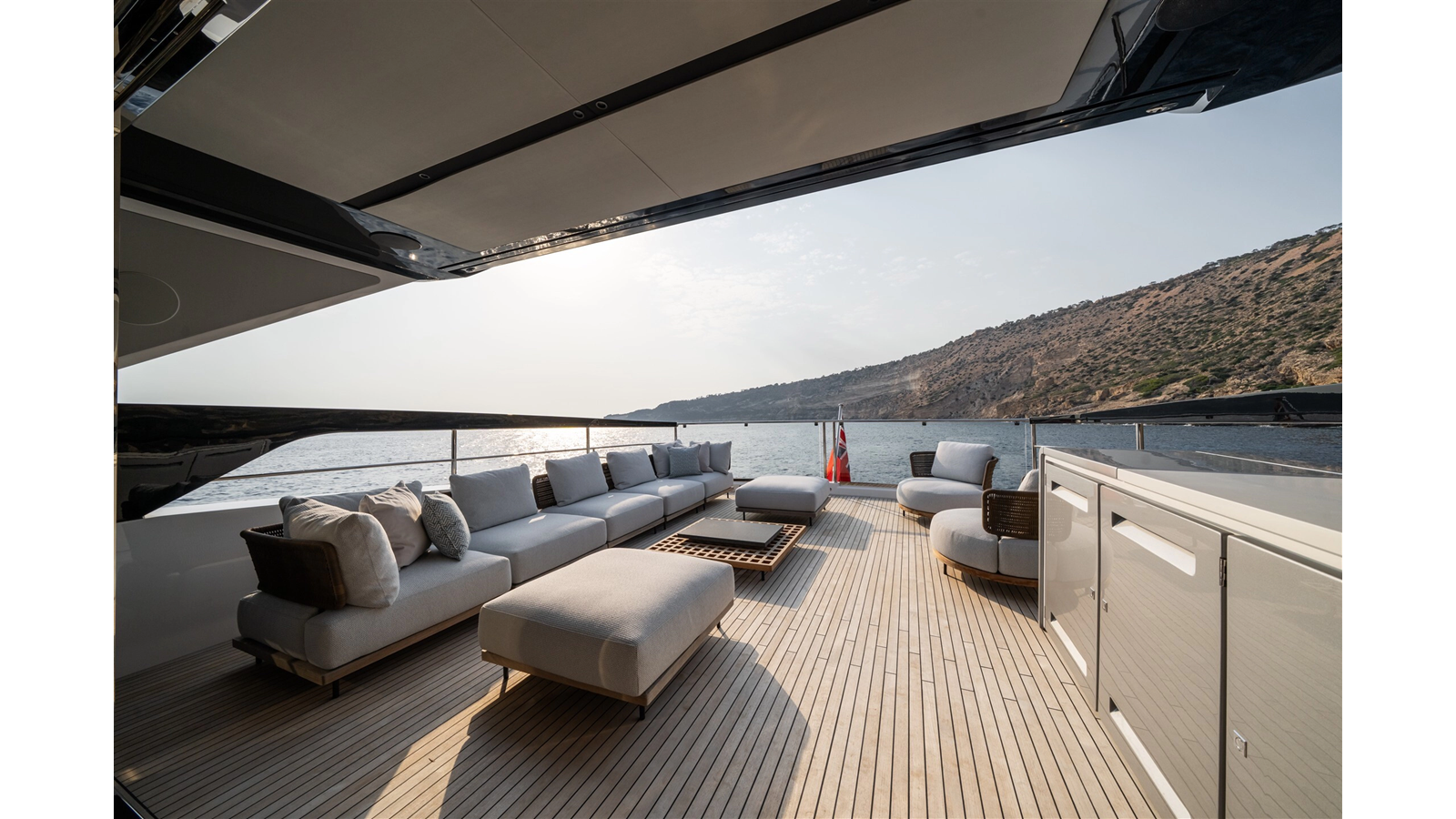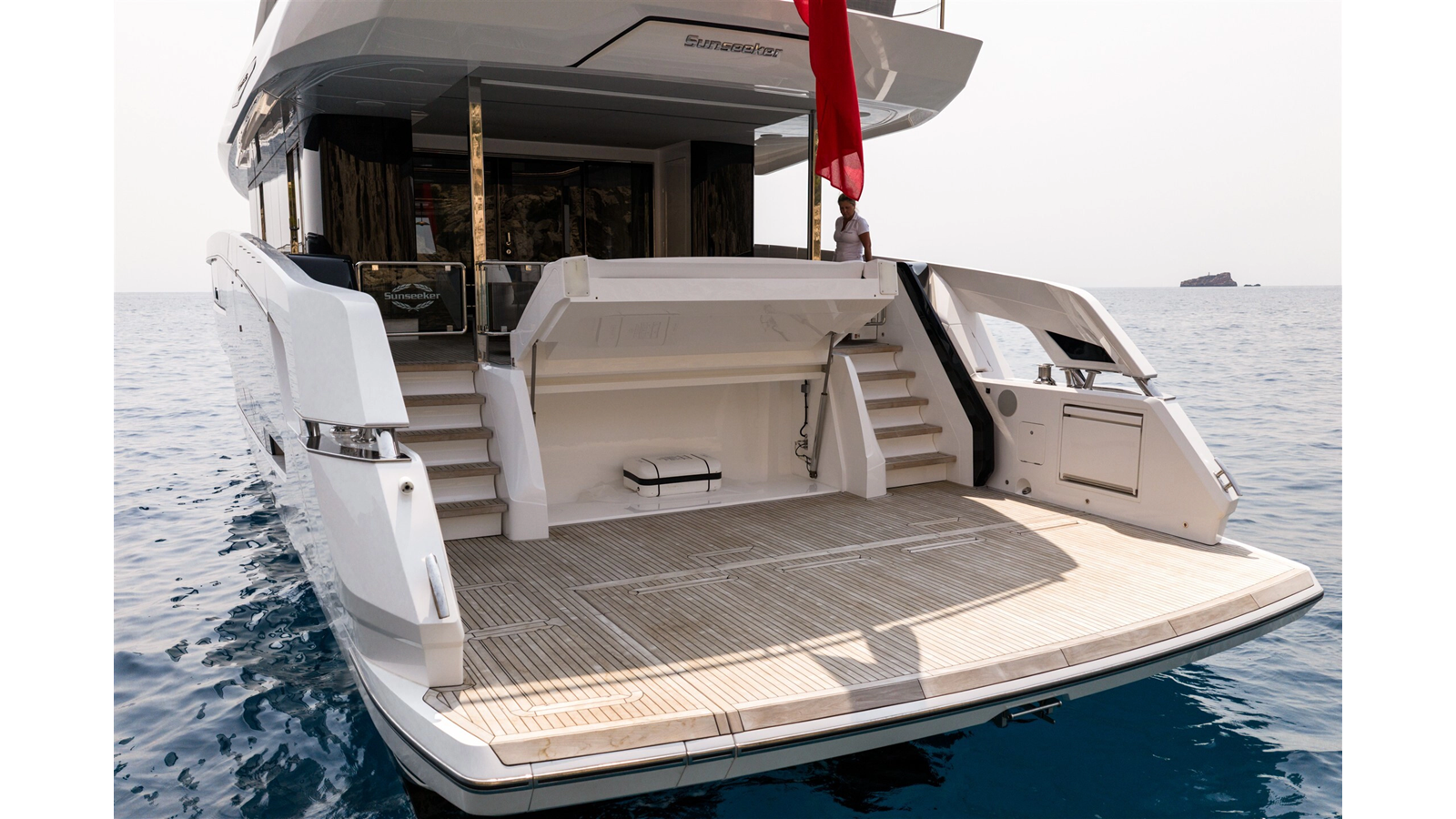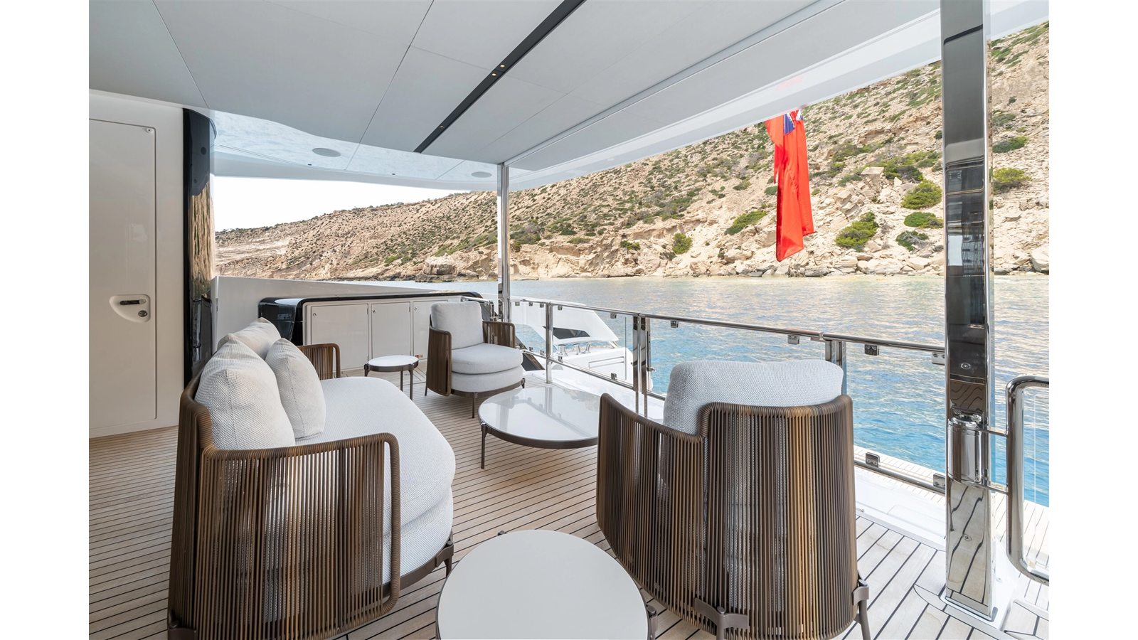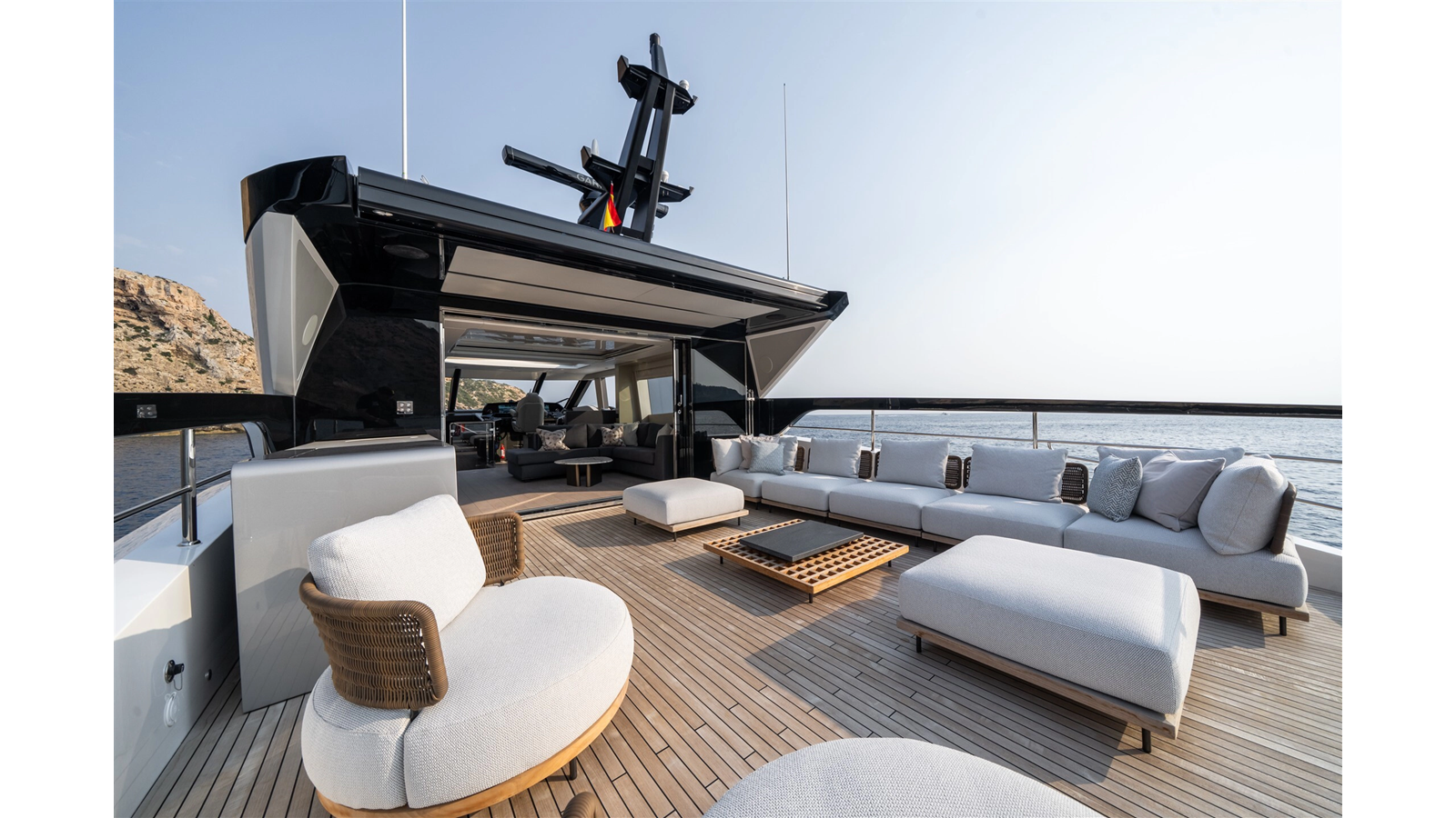 - Integrated exterior staircase from Aft Cockpit to flybridge with Carbon fibre companionway hatch at top of stairs
