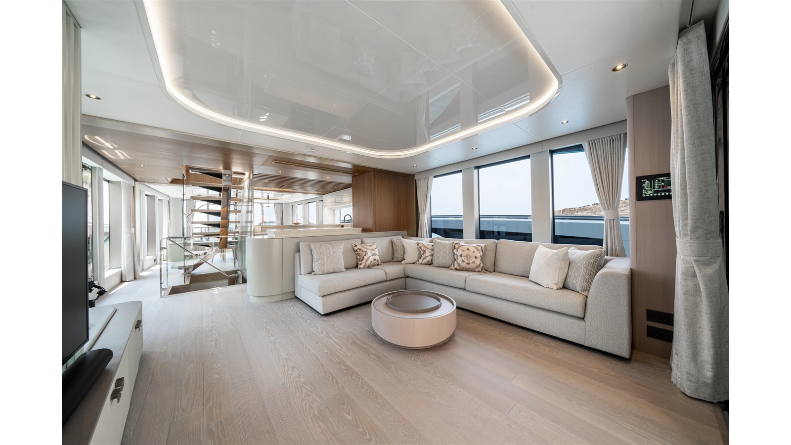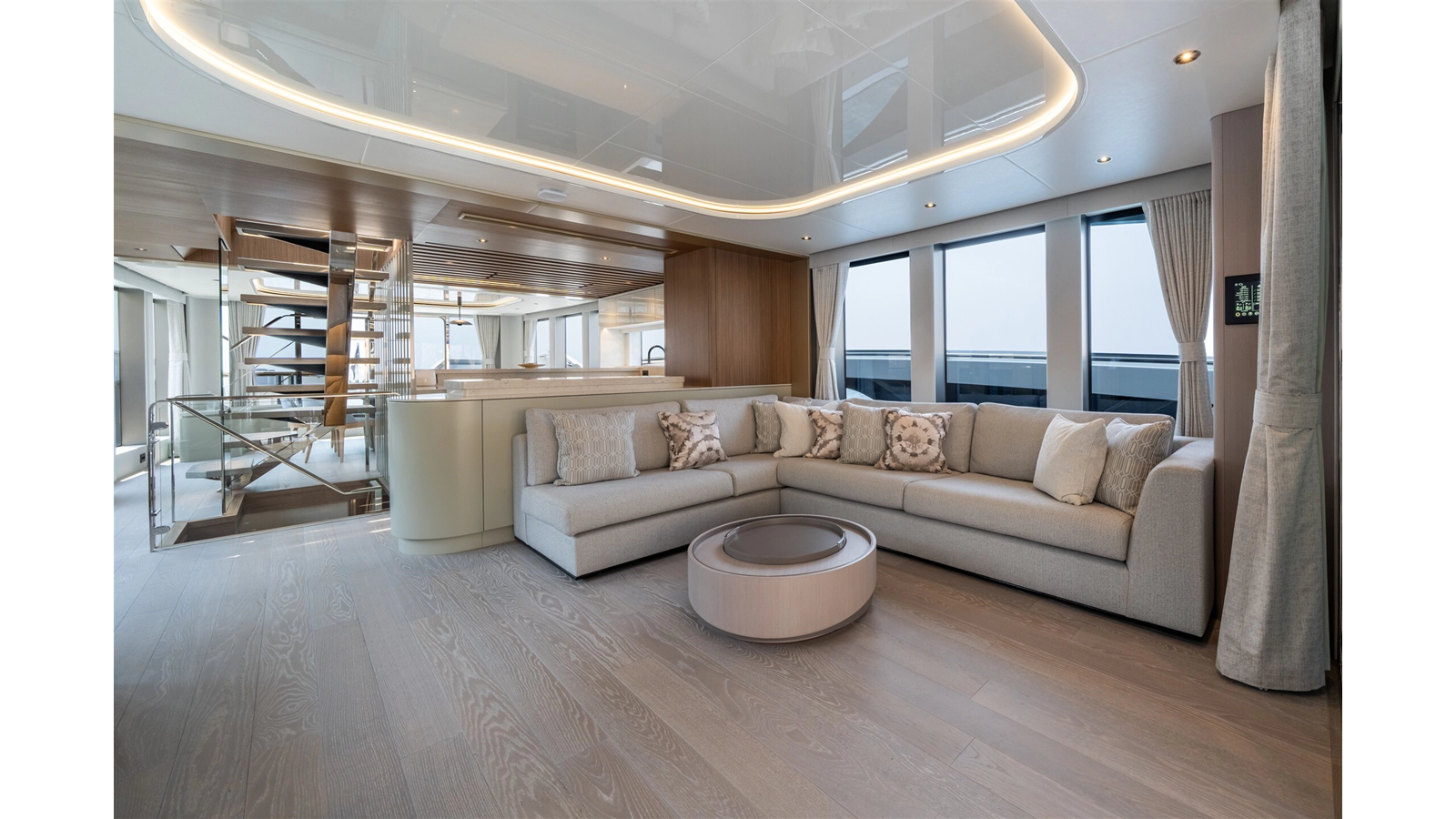 - Upper deck saloon sofa to be adjusted to open the sofa into the helm observation area. Needs to be reviewed. Helm observation area to be shortened appropriately.