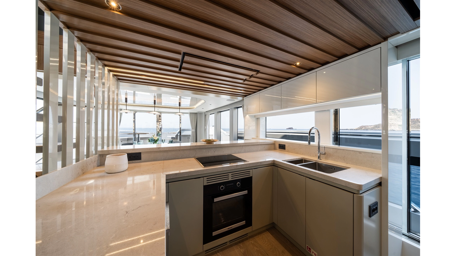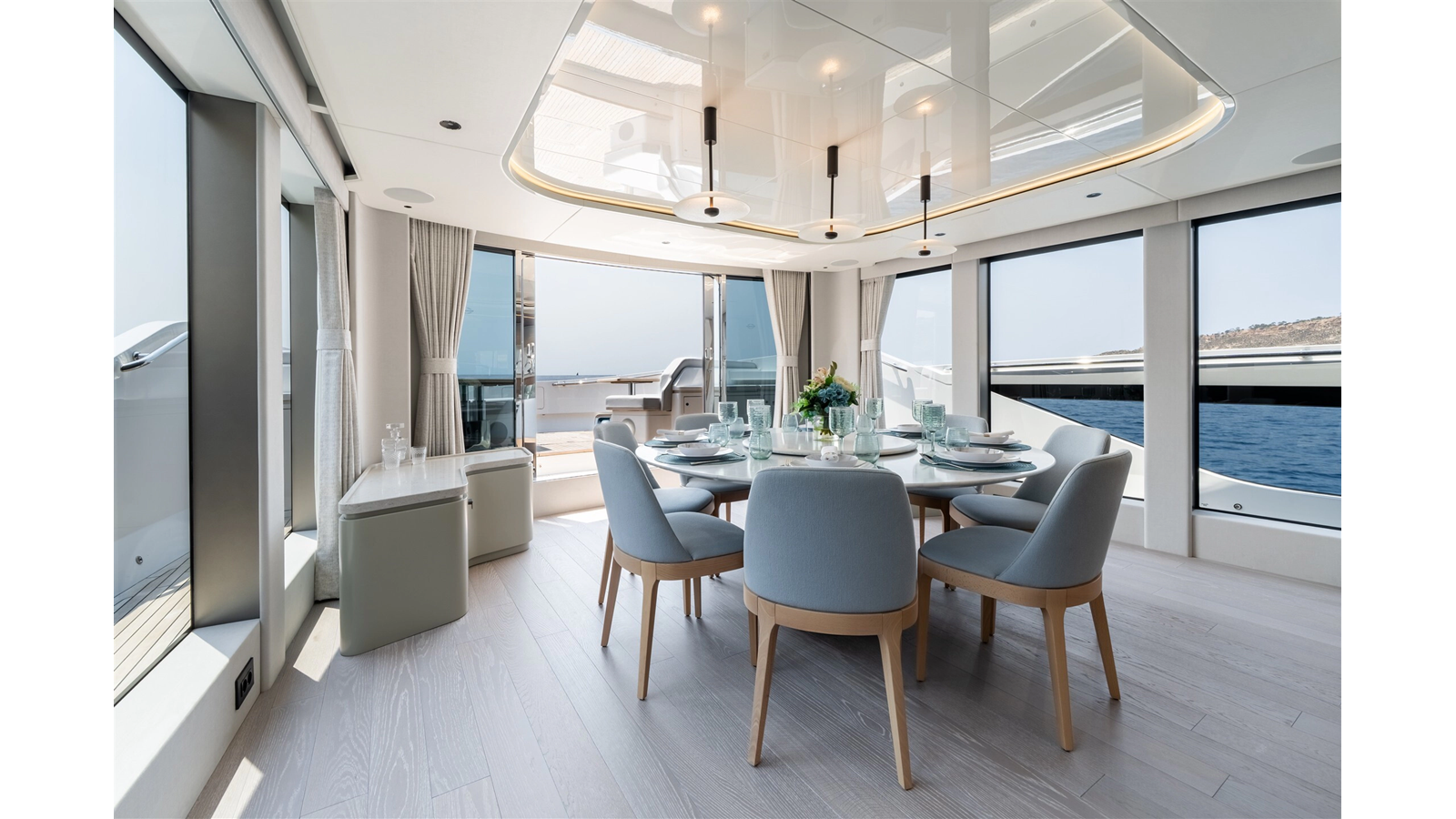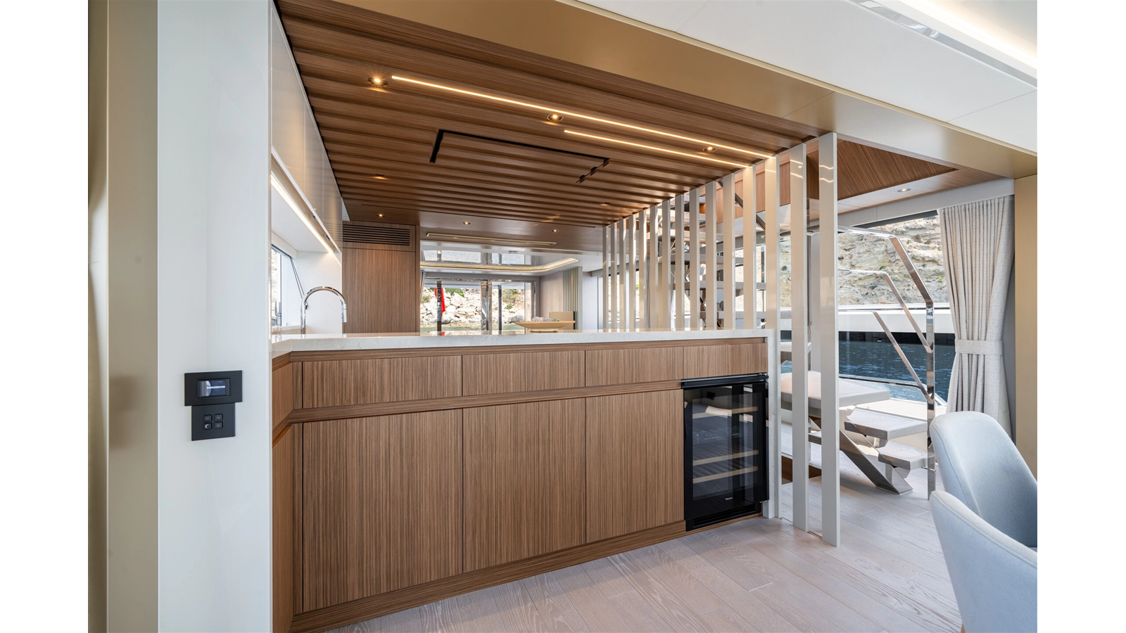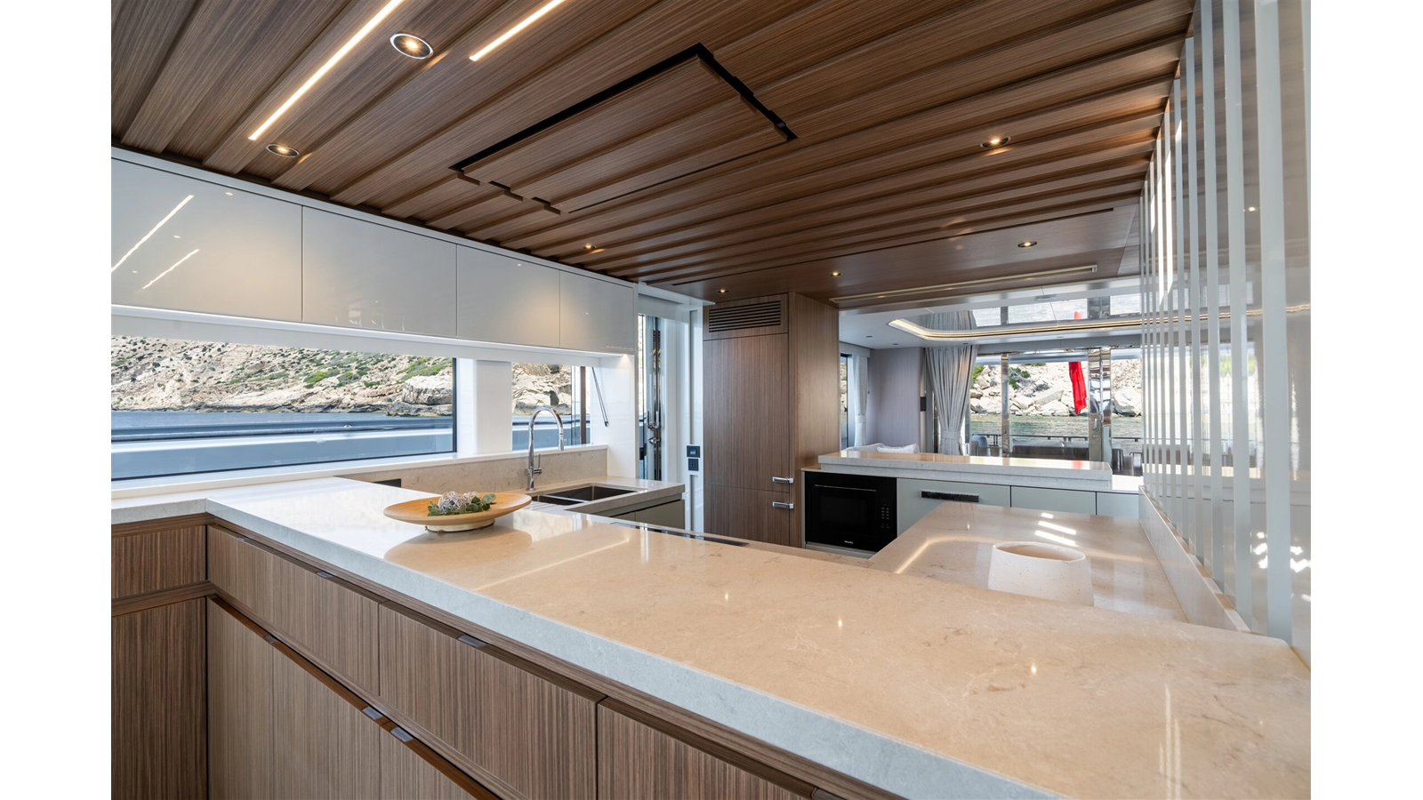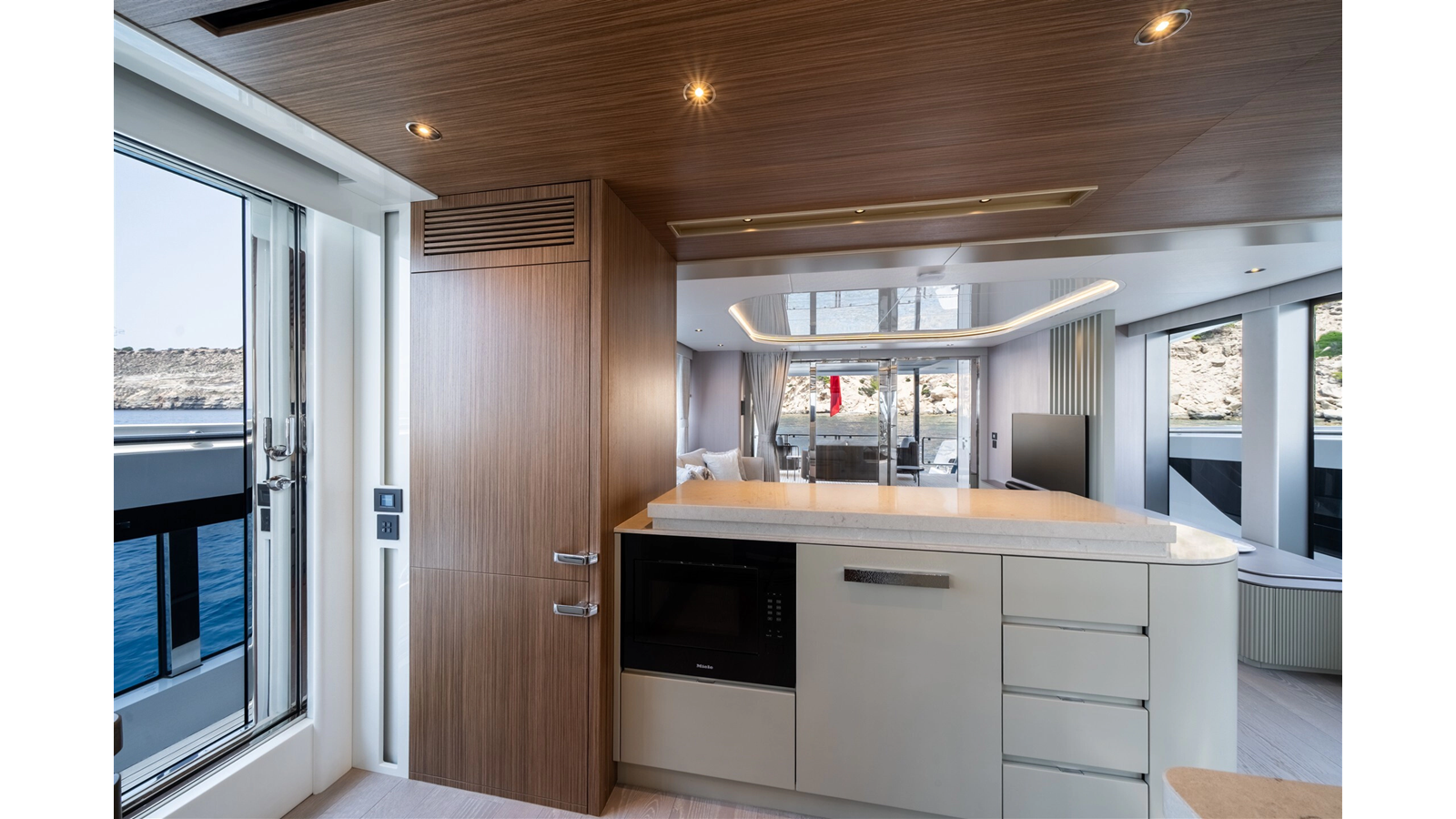 - Main deck configuration - Aft galley with dining to port, mid-level bar with stools and Forward saloon A