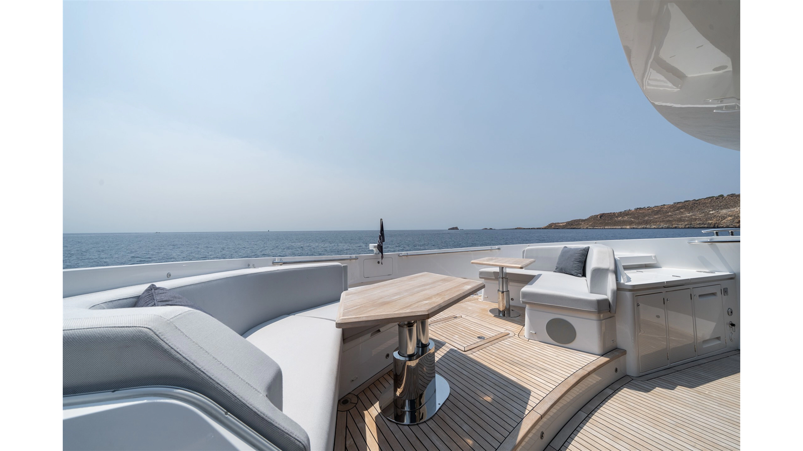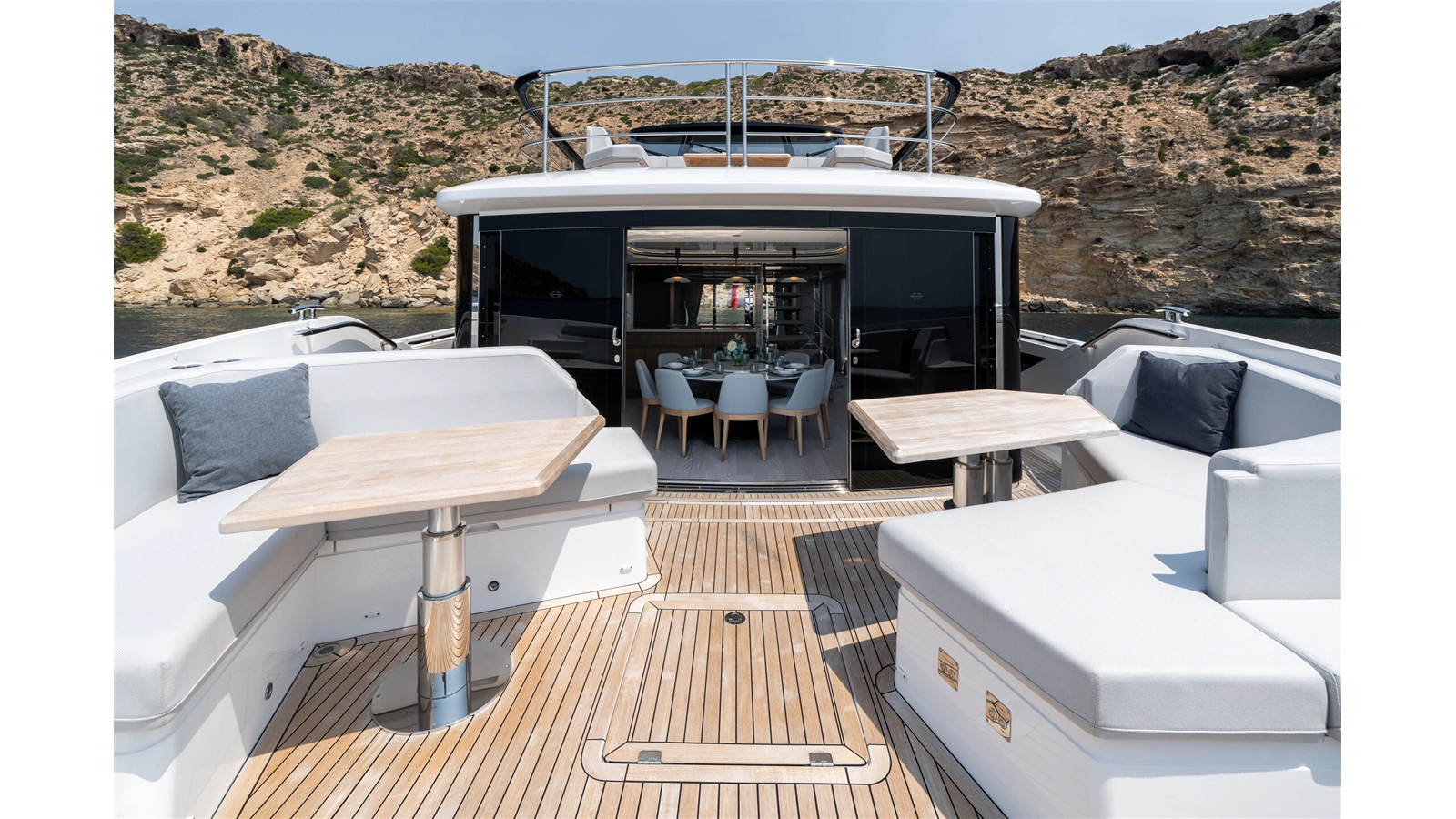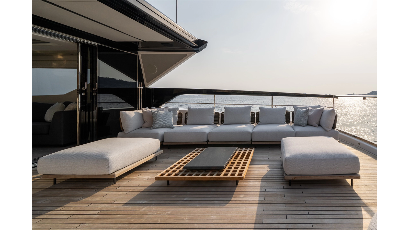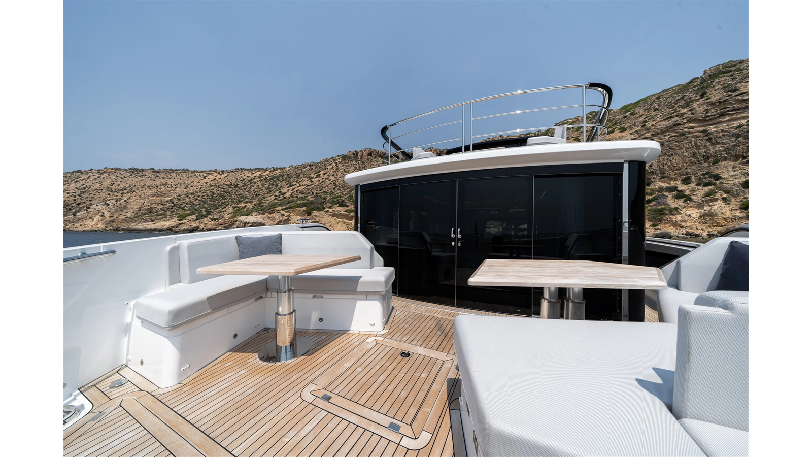 - Twin electric rise and fall tables in Flybridge Aft Upper Deck in lieu of the standard arrangement. Table tops to be Minerva Carrara Gloss Finish in lieu of standard, with infill cushions to convert to sunpad. Table tops to be one piece with no folding leaves.