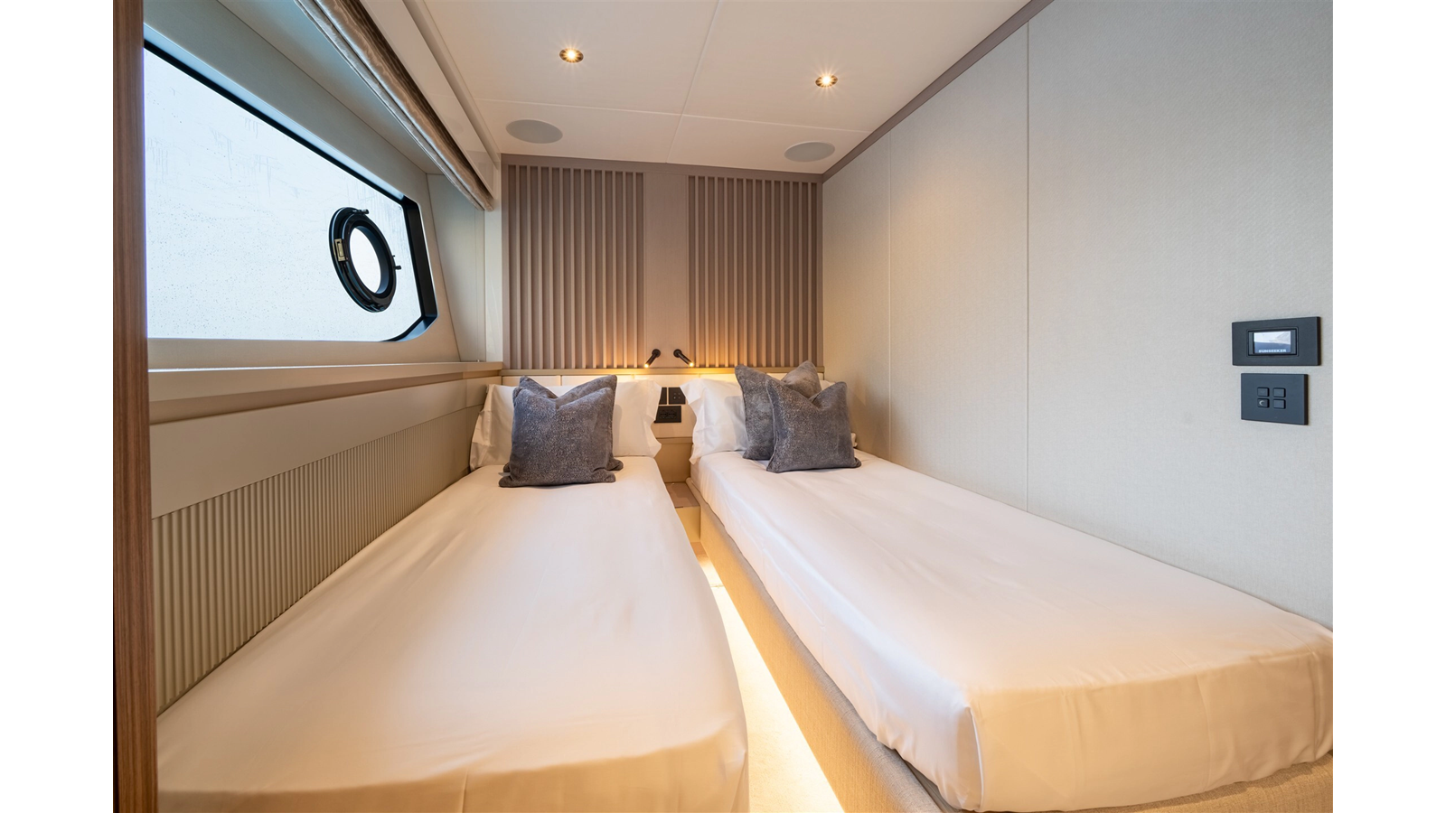 - Port guest cabin to be configured with single beds with inboard bed sliding to create a double. Ensure that bed coverings are ordered for both double and single set up. Exteri