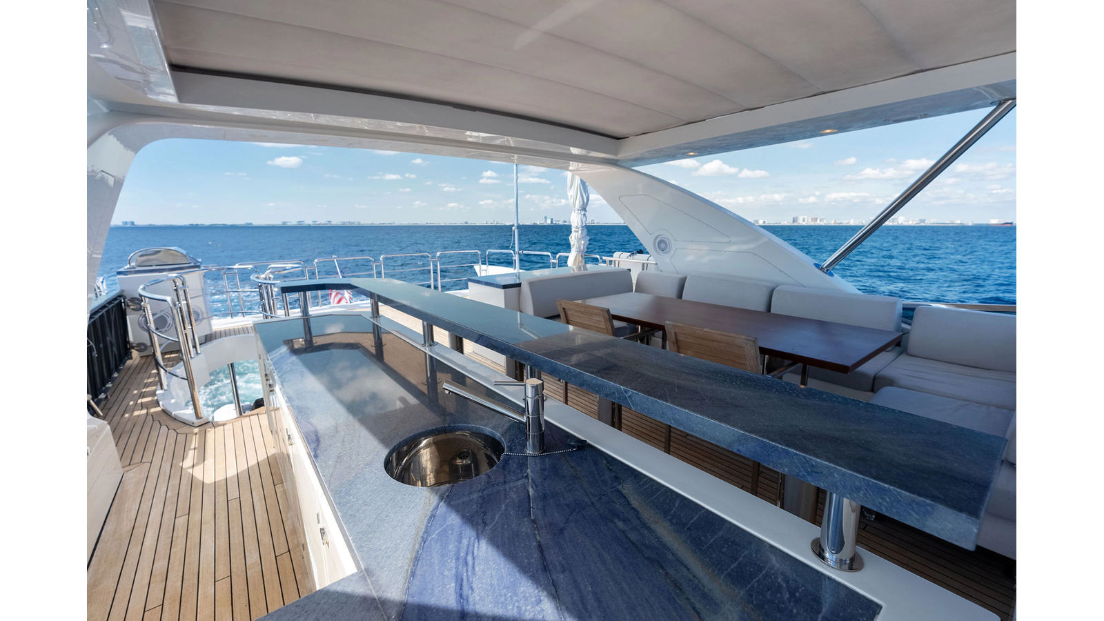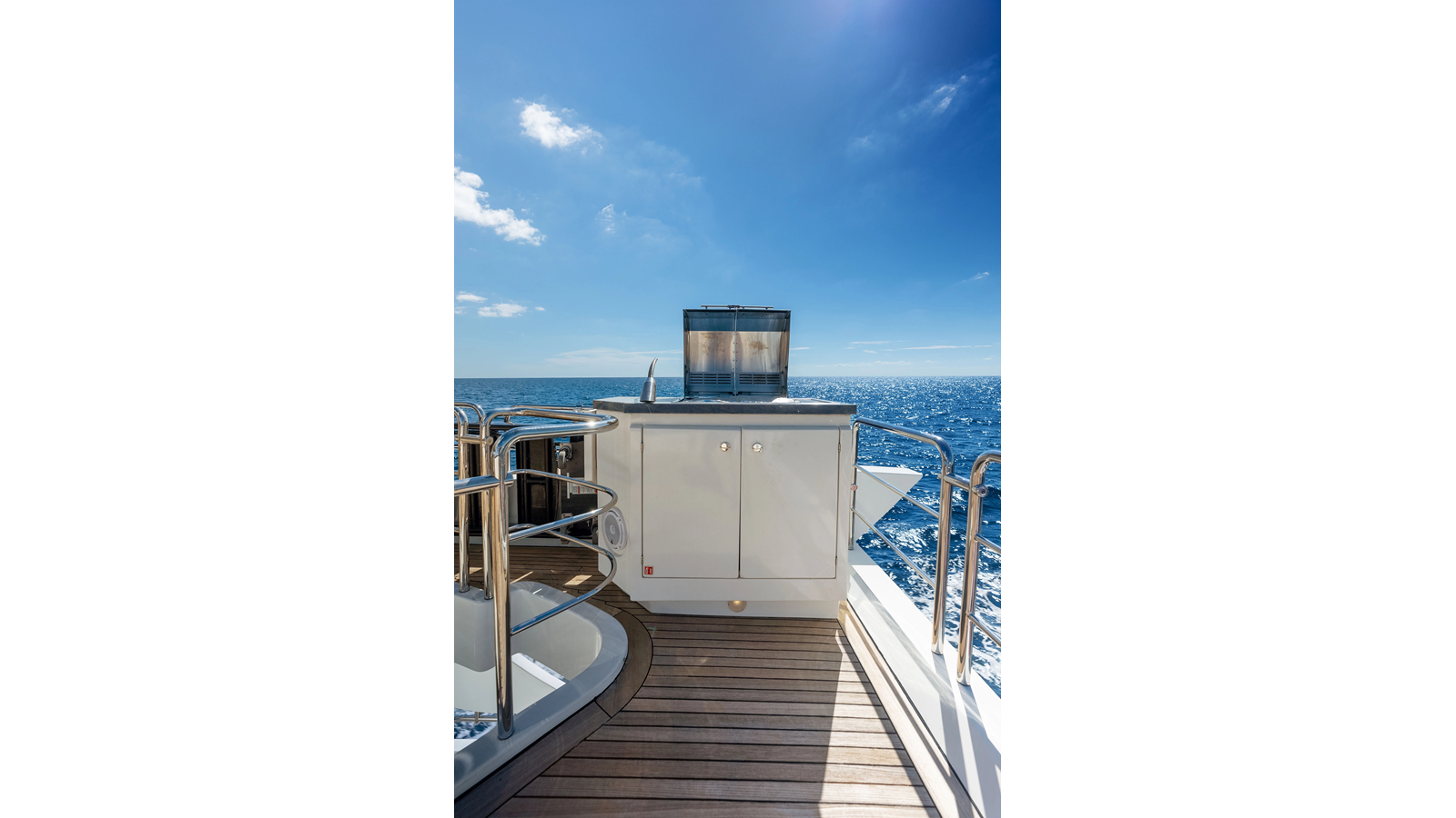 - Custom bbq cabinet in the aft starboard corner equipped with one Kenyon Texan grill