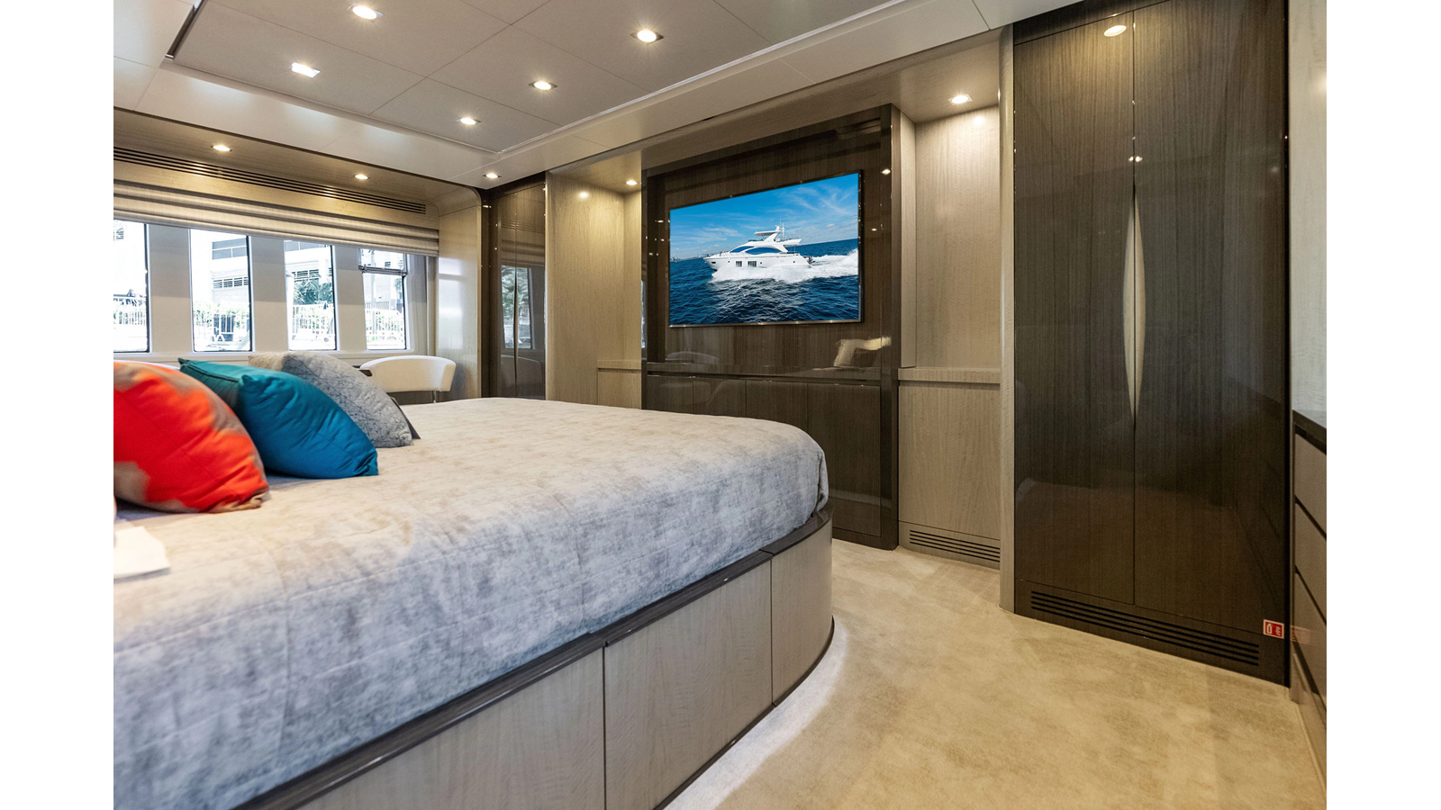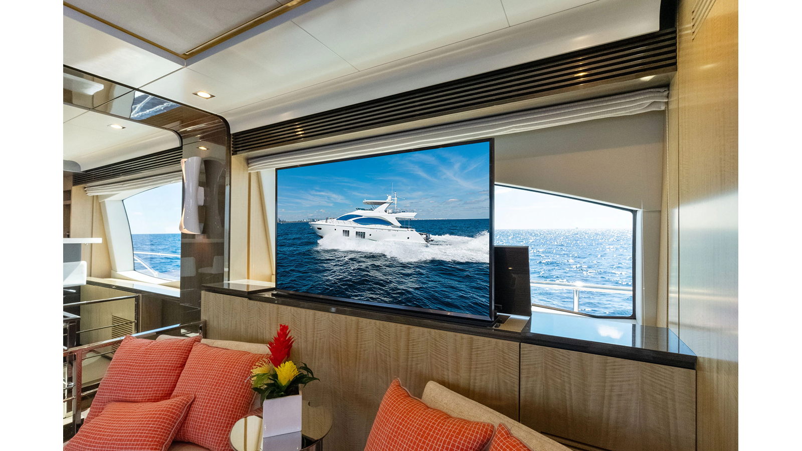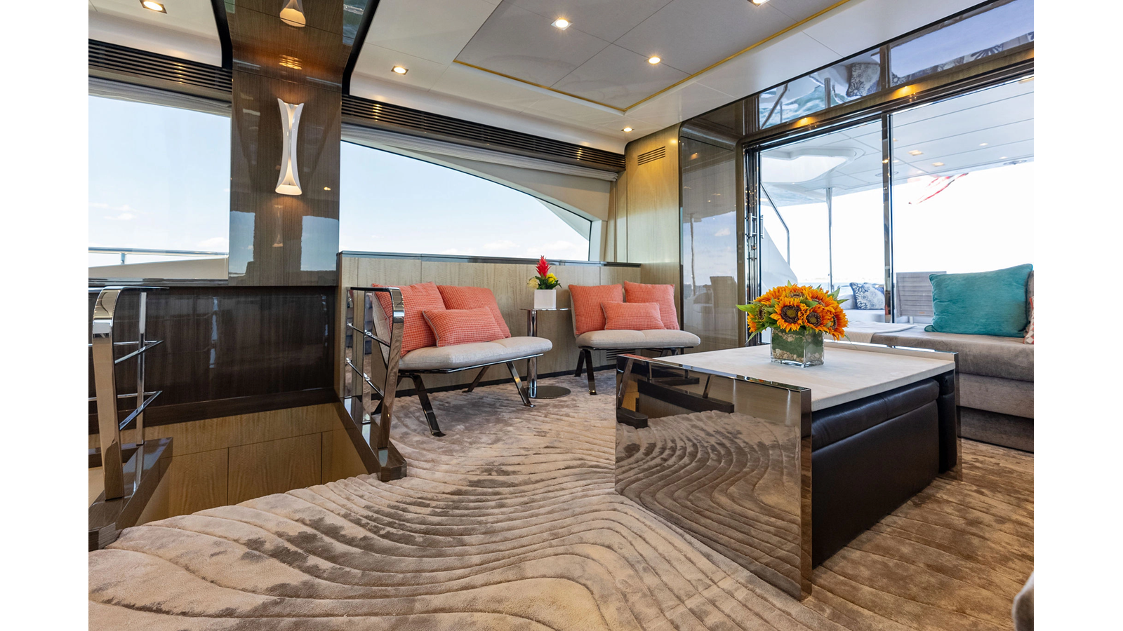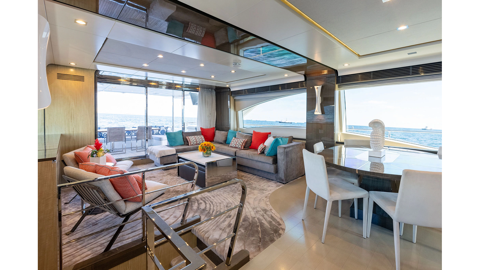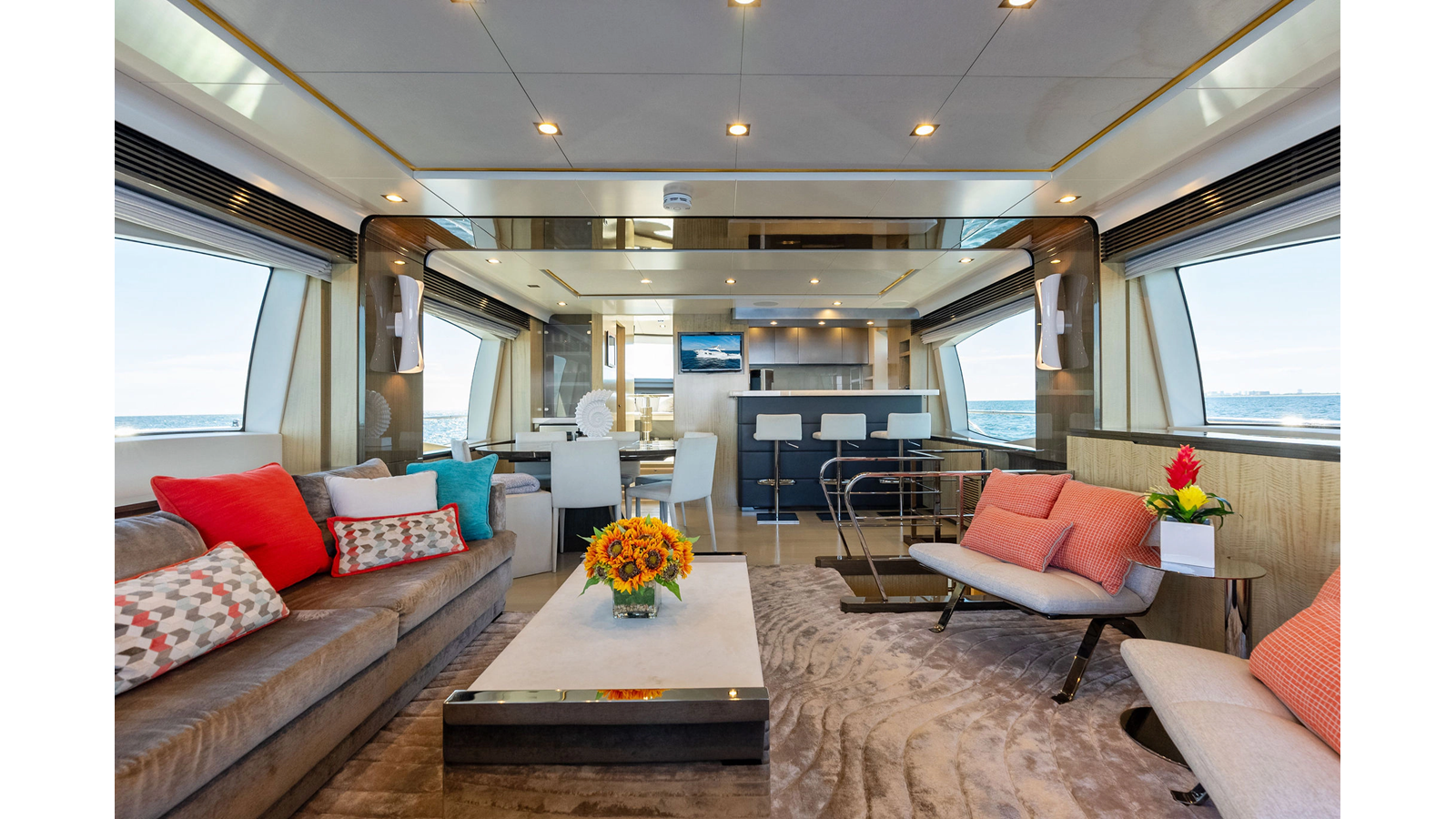Inside, SATISFACTION exudes luxury with its hand-picked Italian marble, deep pile carpeting, and bespoke seating throughout. The main saloon offers an open layout, boasting a spacious lounging area on the port side and a dining area forward. Large windows flood the space with natural light, creating an inviting and well-lit entertainment area.