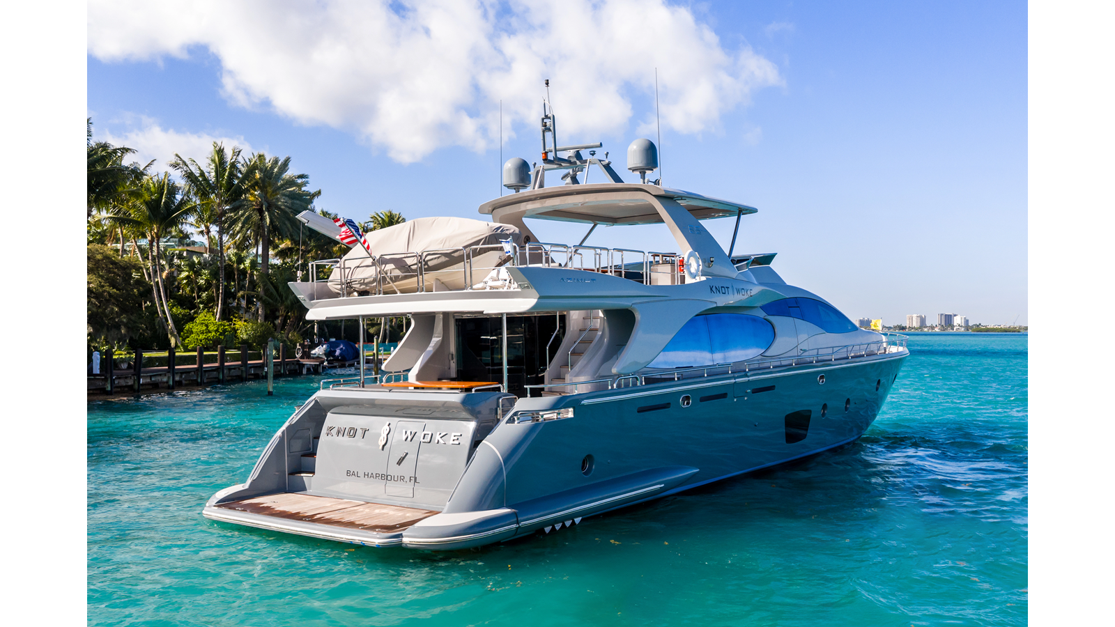 Knot Woke is a 2009 Azimut 85 that has undergone an extensive refit, with over $1M invested to bring her to a fresh, modern standard. During her time in the yard, she received new exterior paint, new teak decking, updated cushions, new salon flooring, as well as new A/C chillers and converters, along with numerous additional upgrades throughout.