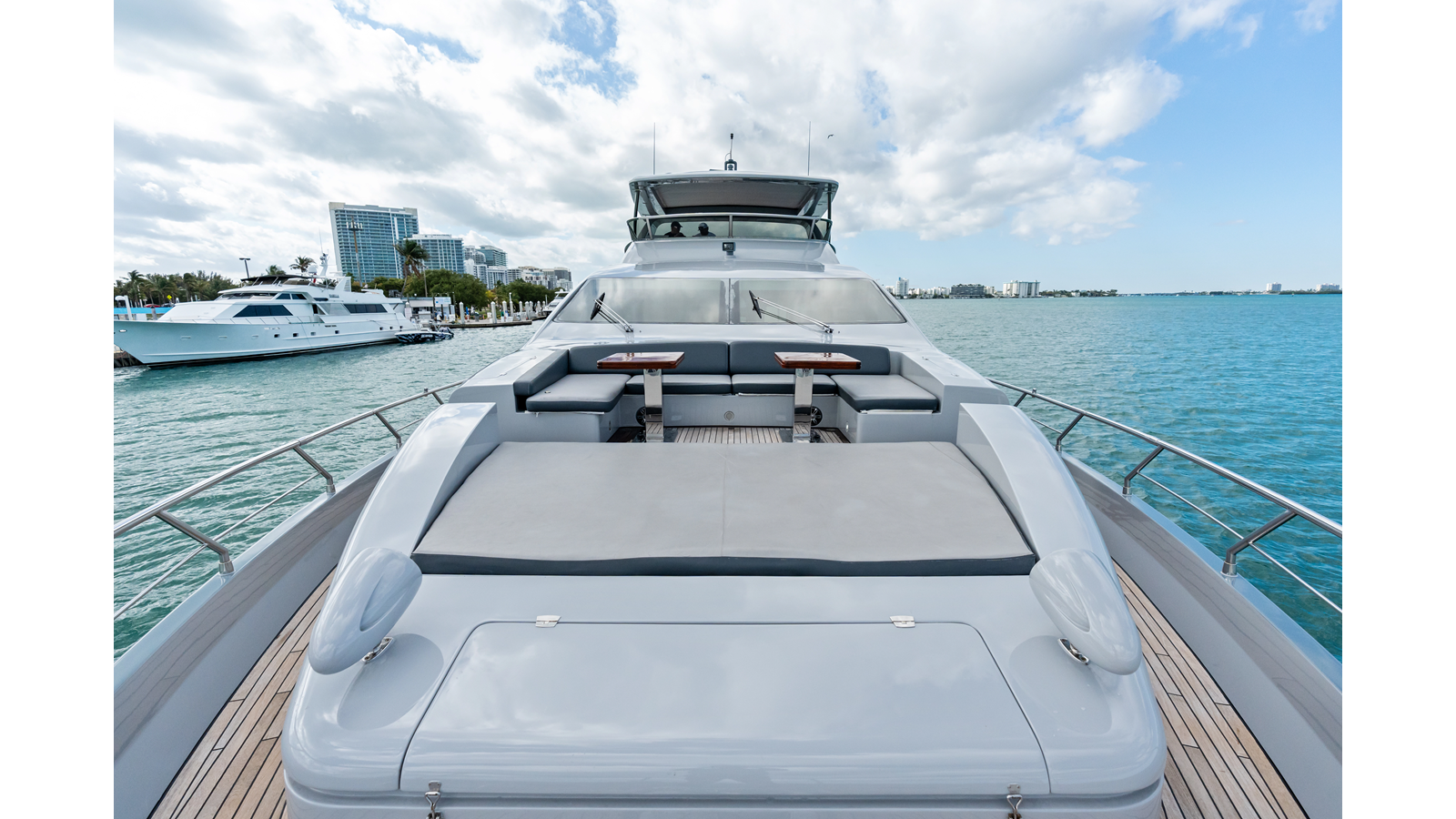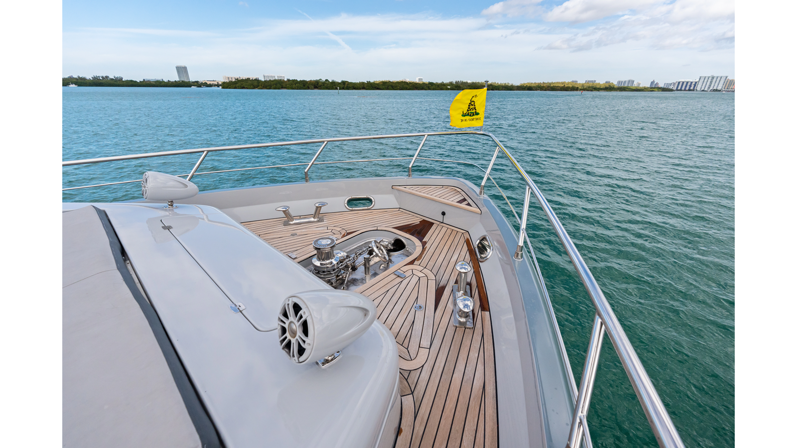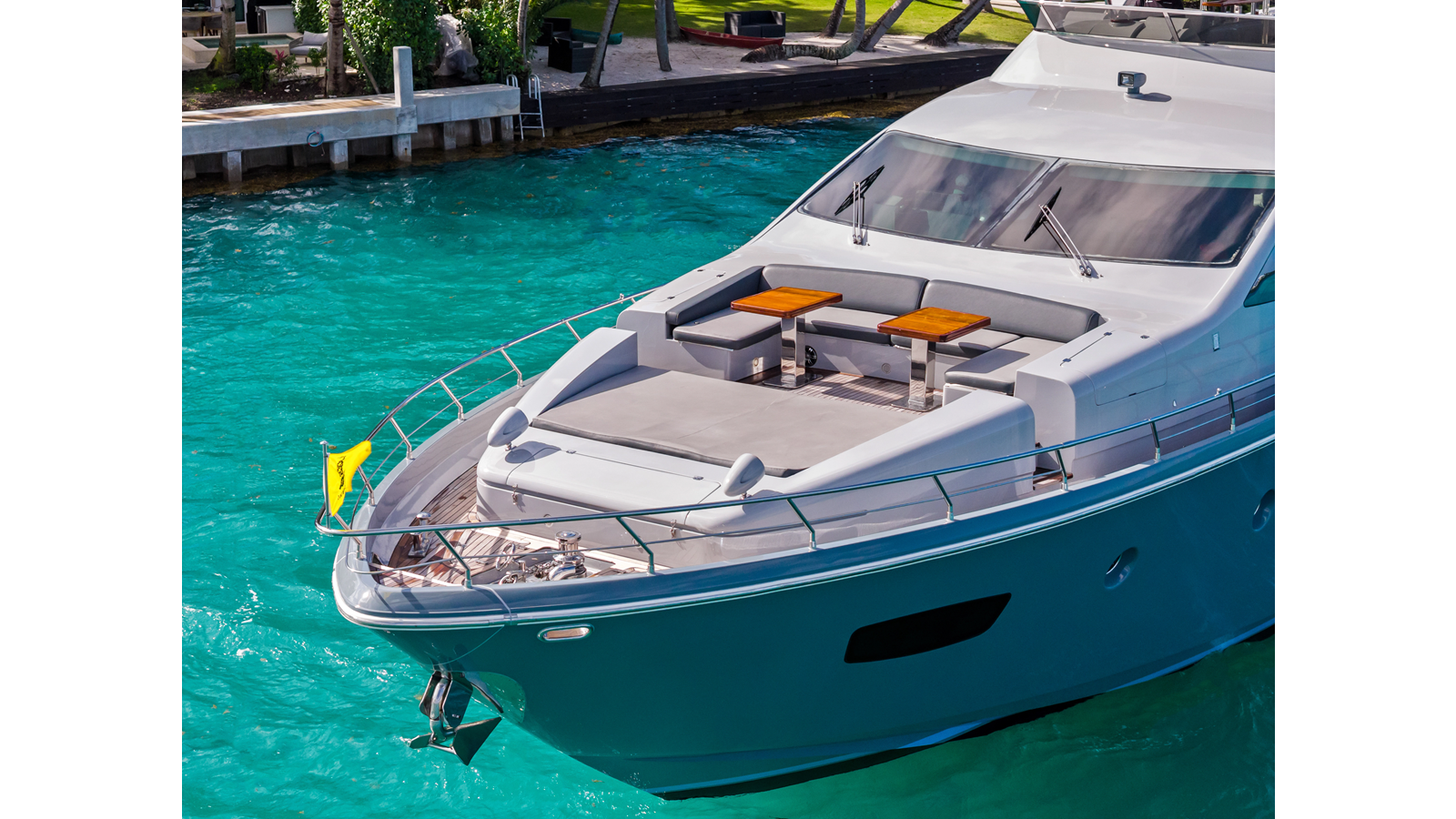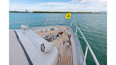- Stainless steel bow rails and stanchions; flagstaff at the bow