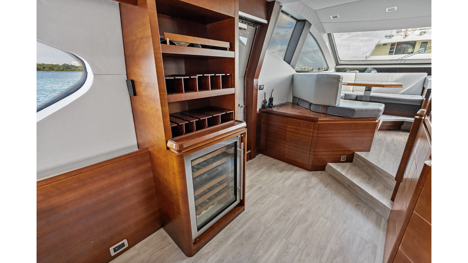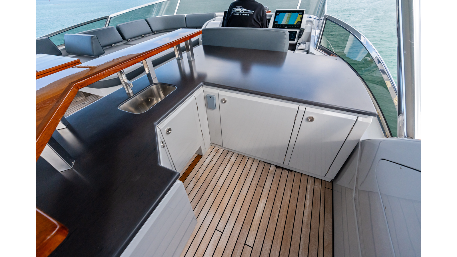 - Wet bar, aft of helm bench seat, with sink with hot and cold water faucet, Isotherm refrigerator, and Fusion stereo