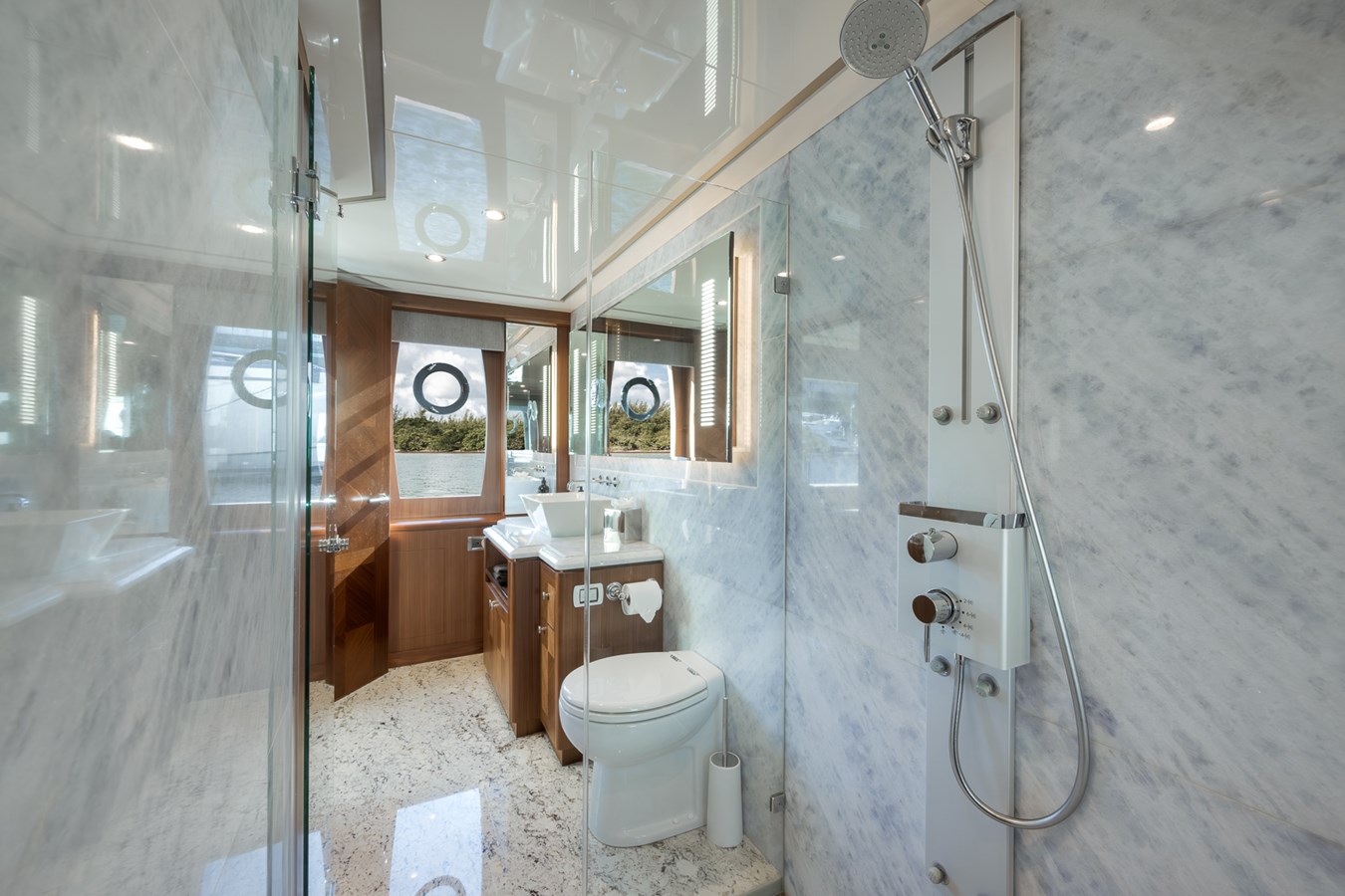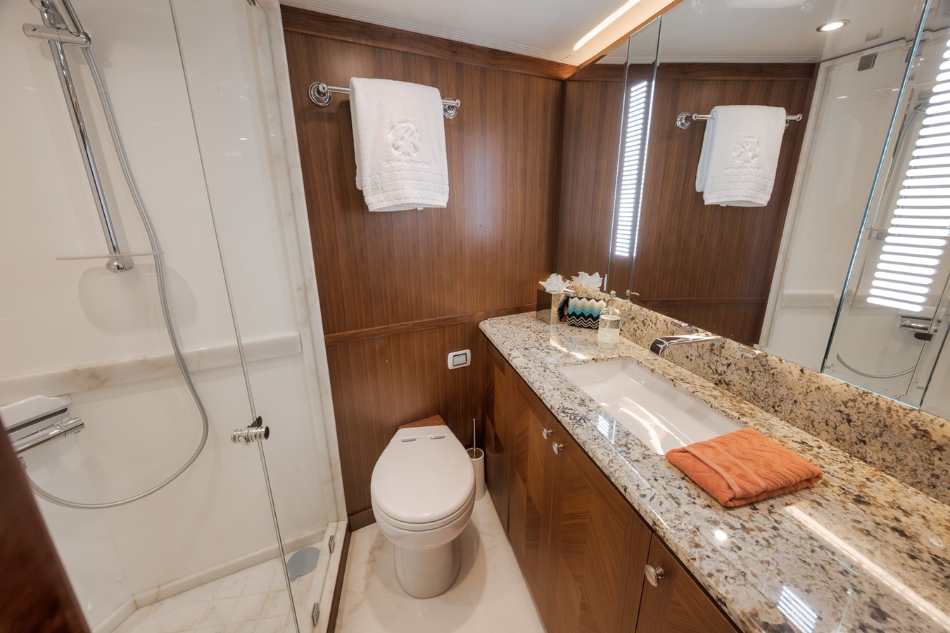 - LED TV’s in Main Salon and master stateroom with A/V System, all guest staterooms, aft deck (flip down), flybridge, and crew areas with DirecTV satellite receivers and Starlink