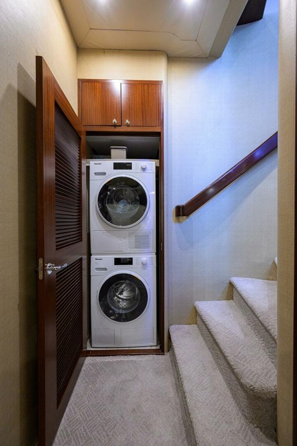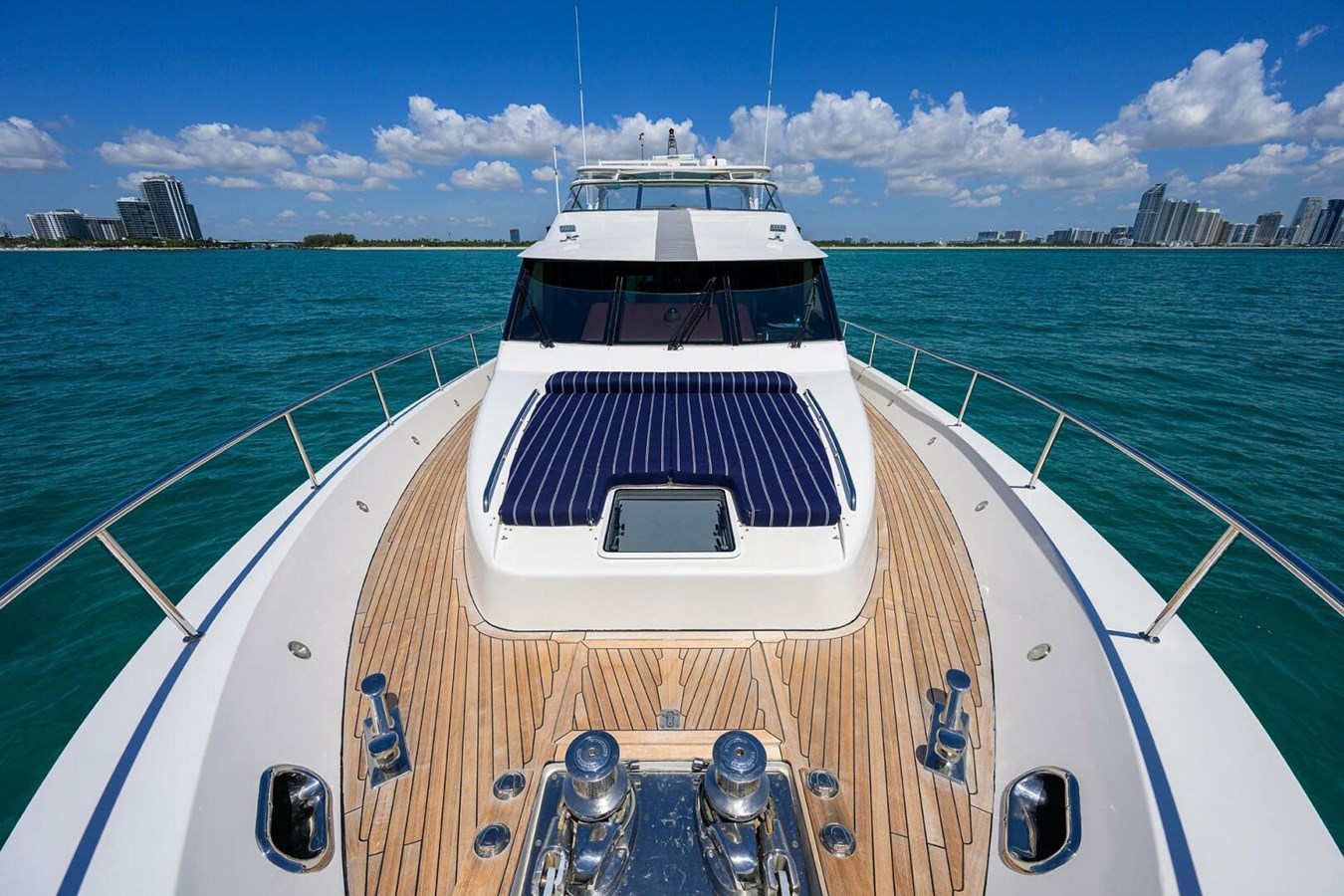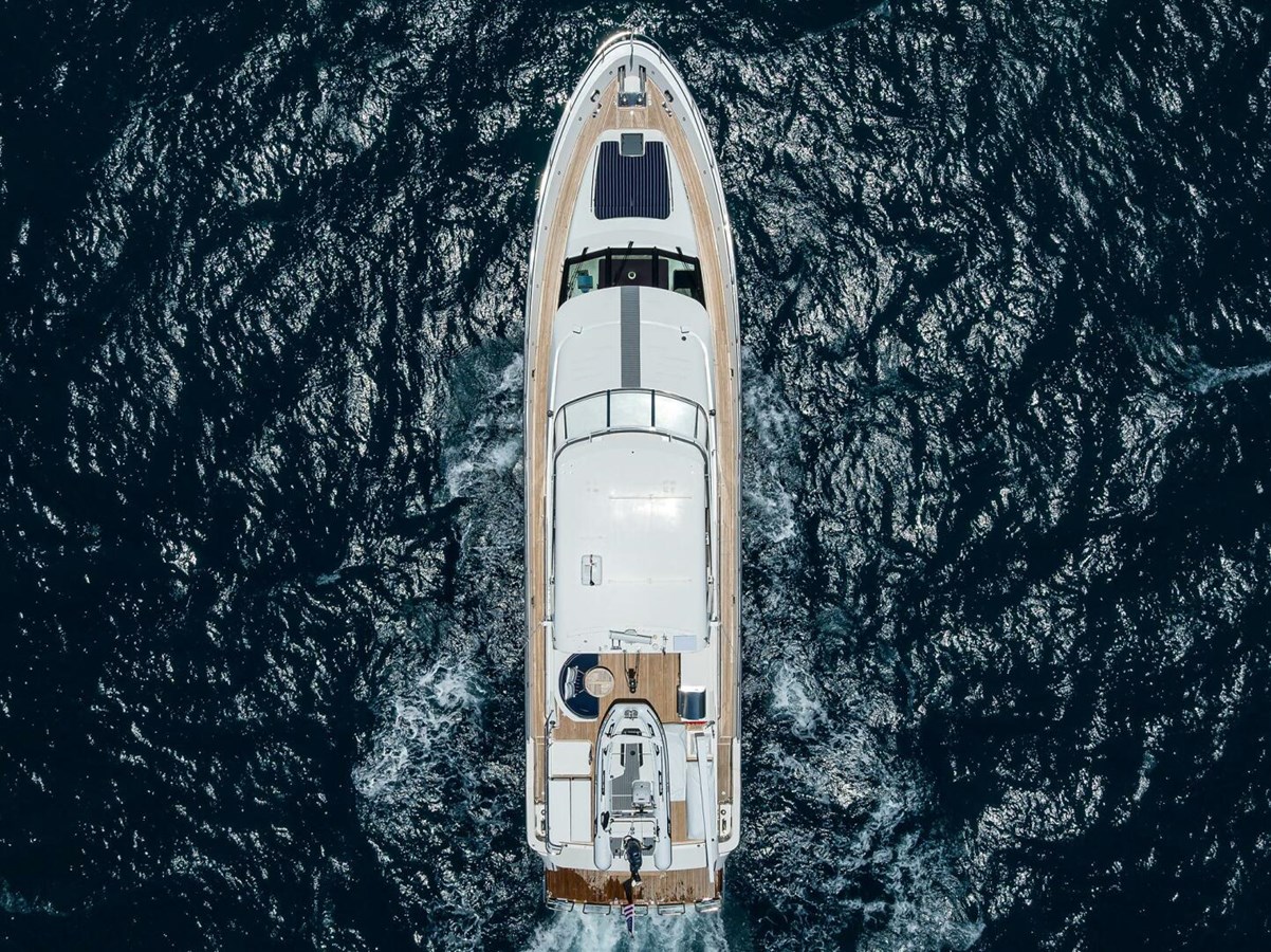 The yacht’s full Burmese teak decking spans the aft deck, flybridge, side decks, and foredeck, creating a rich and luxurious appearance rarely found on this model.