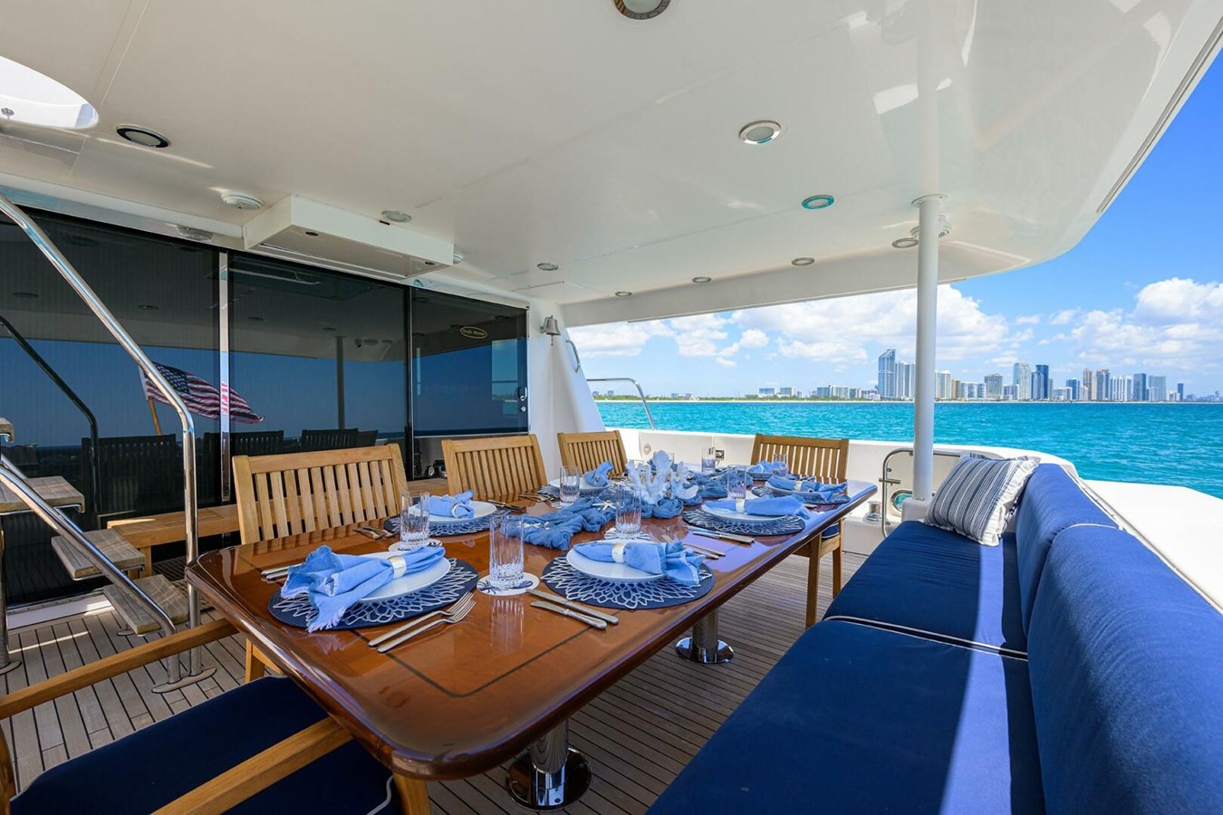 Boarding from the dock via the new boarding ladder and optional aft gates leads to a spacious aft deck designed for alfresco entertaining. A large teak dining table with surrounding seating provides an elegant setting for outdoor meals, complemented by a dropdown television for entertainment.