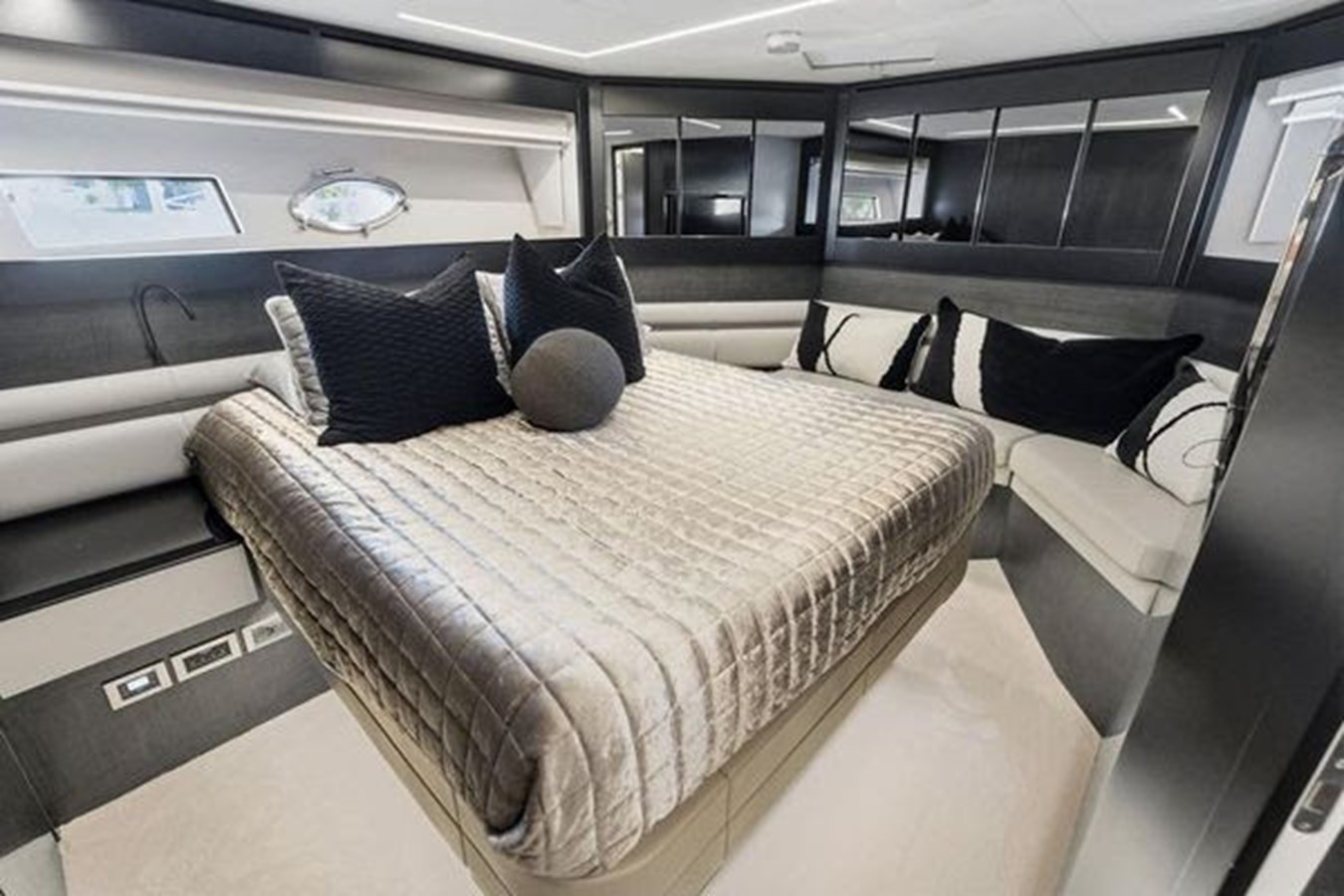 The interior of the 9X is sophisticated and inviting, featuring large windows that flood the salon with natural light, enhancing the sleek interiors finished in leather, carbon fiber, and polished metals. The full-beam master suite and three beautifully appointed guest cabins offer unparalleled comfort, while the cutting-edge helm station ensures that total control is always at your fingertips.