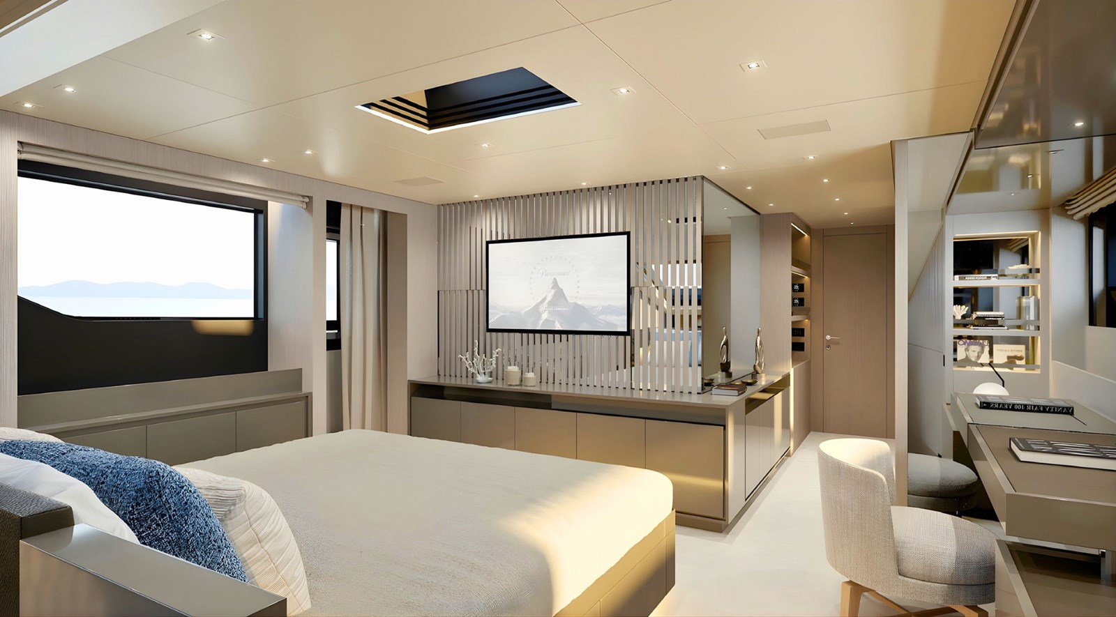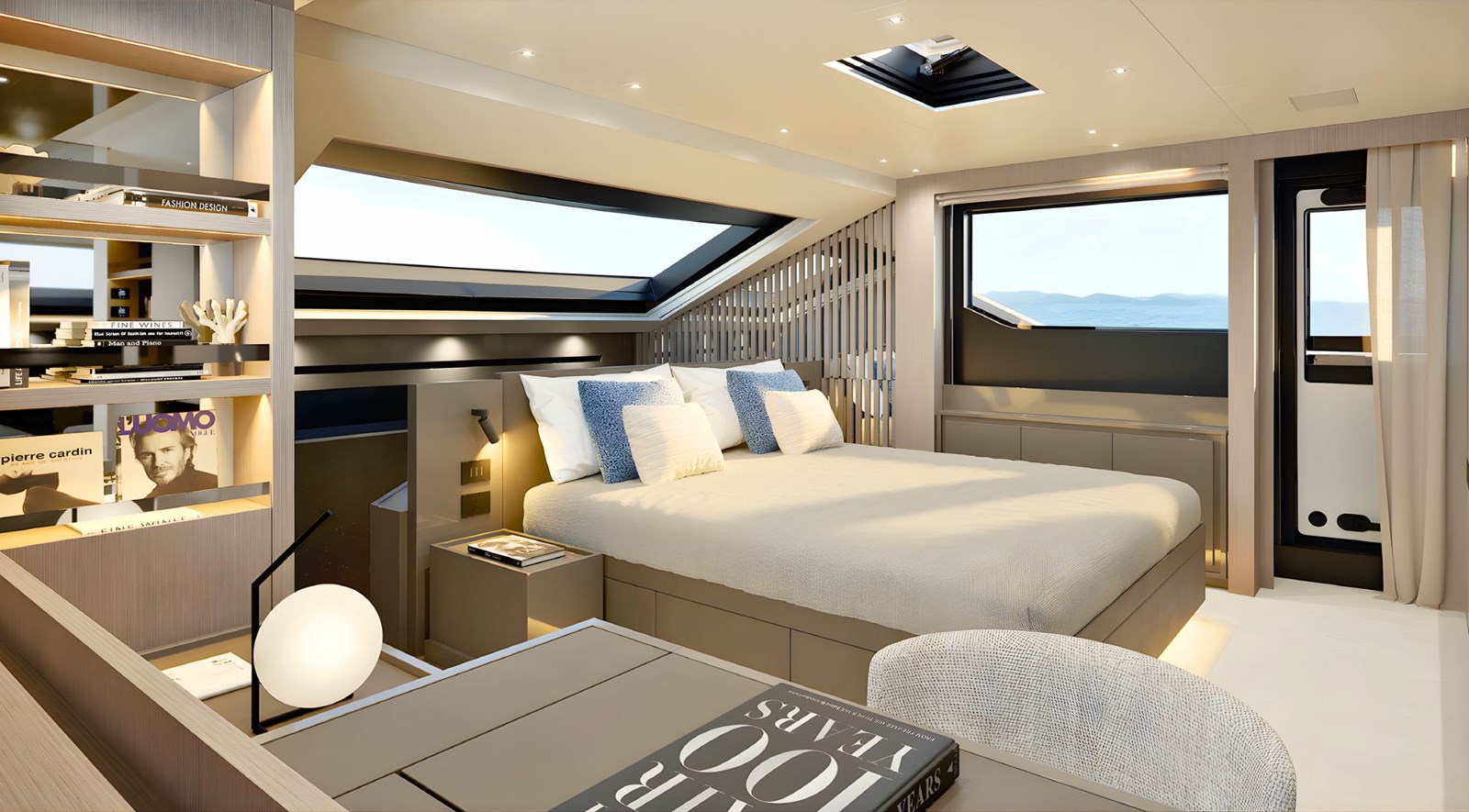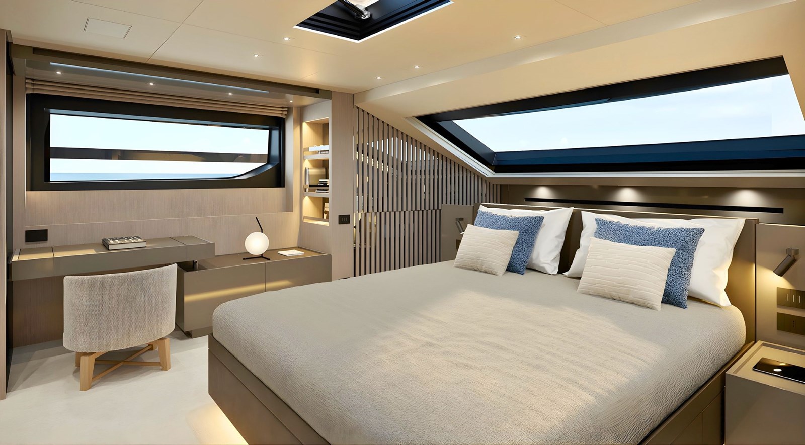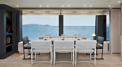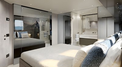 - Five ensuite cabins accommodating up to 11 guests, featuring a main-deck master cabin with direct access to the owner’s bow terrace